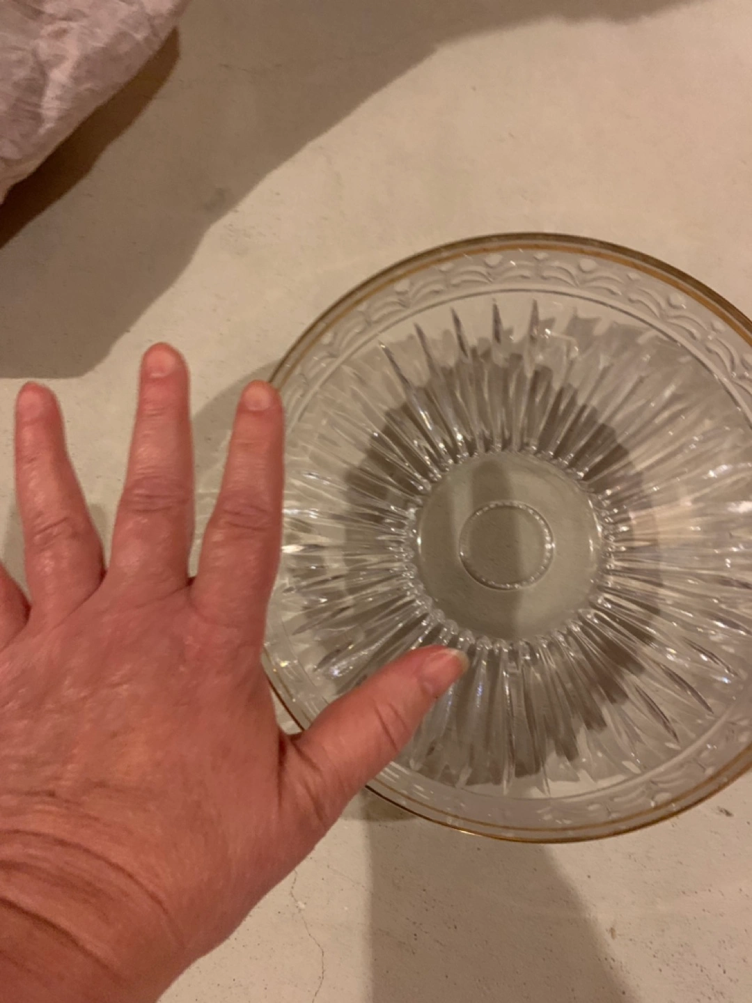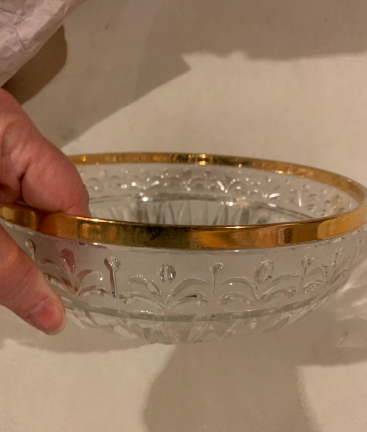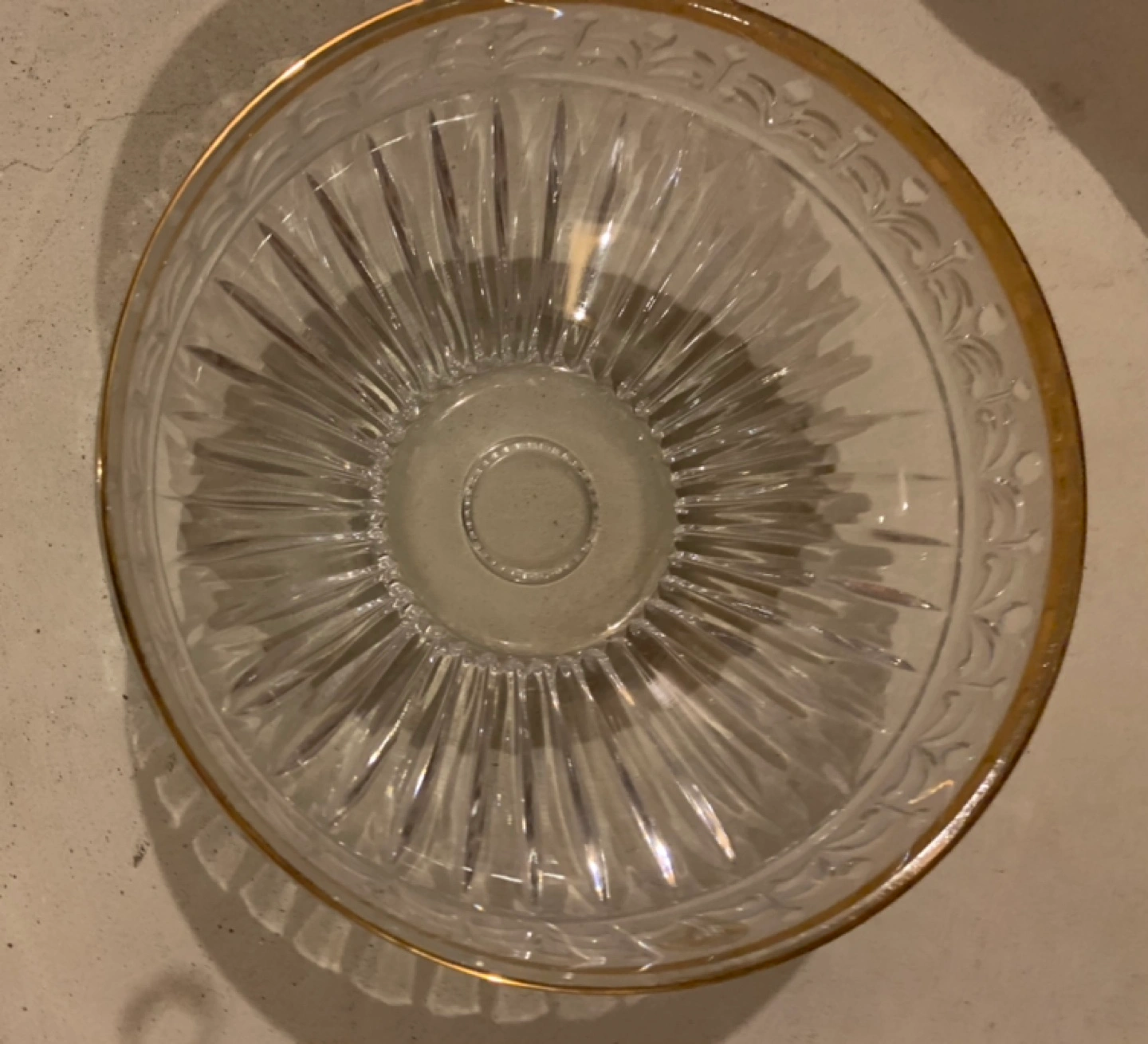 Crystal Serving Bowl with Real 14k Gold Plated Trim Clear crystal serving bowl with a gold trim. The bowl has a fluted design and is in excellent (like new) condition. Moving sale - non smoking & no pet household