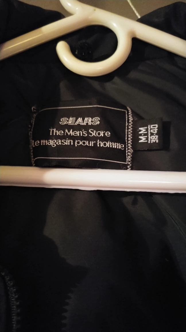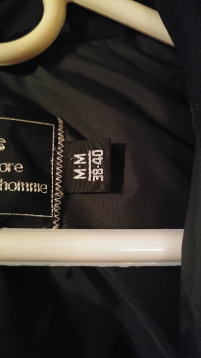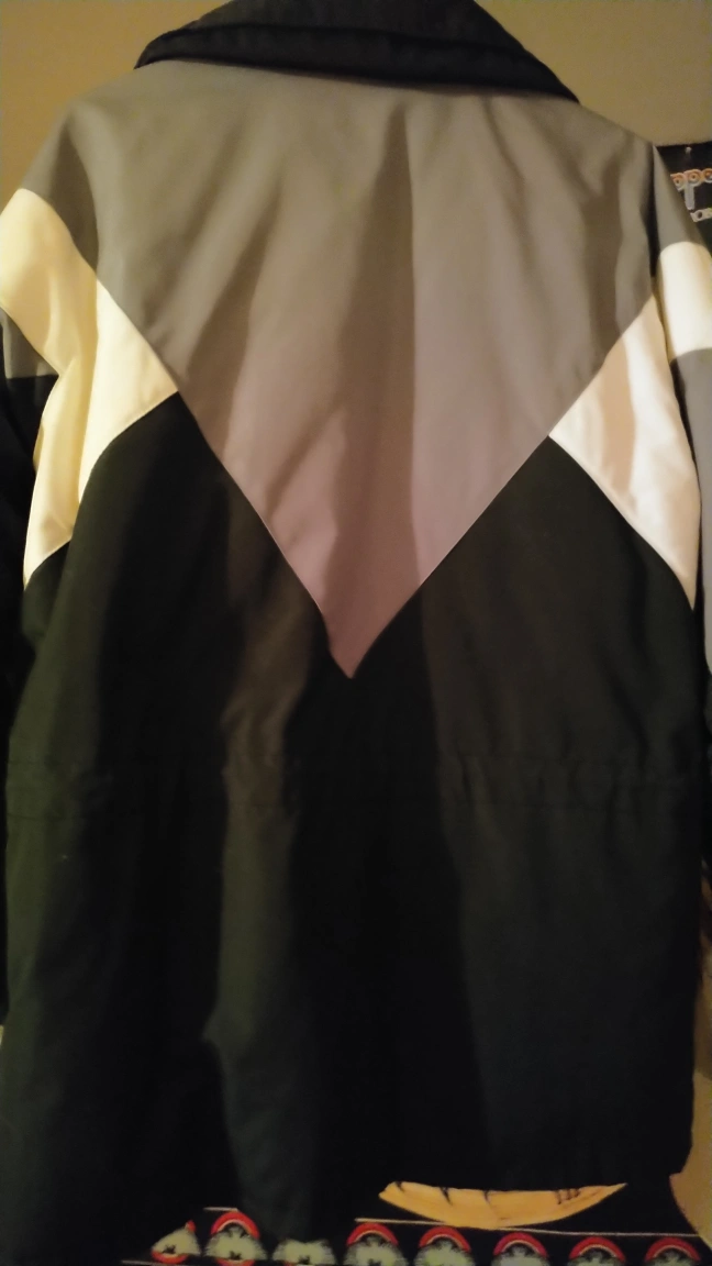 Black, grey, and white winter jacket with a hood. Has a zipper closure and button closures. The jacket is lightly padded.