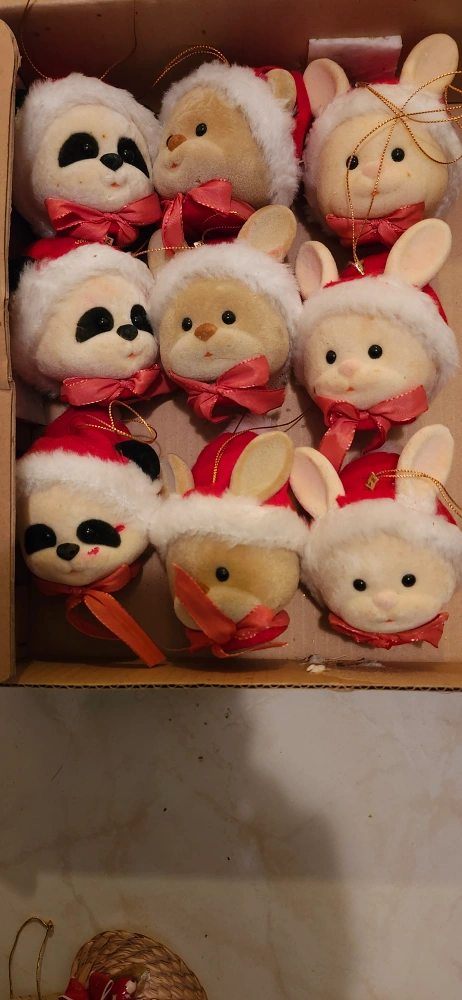 Plush bear ornament wearing a Santa hat, with a red bow. It has a gold cord to hang around door handle or Christmas tree.