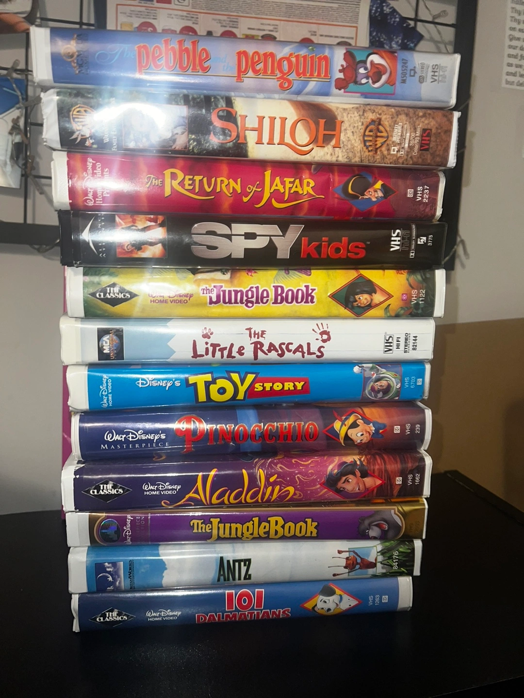 Collection of 12 VHS movies. Includes titles such as Toy Story, Aladdin, The Jungle Book, and more. All 12 for 10$