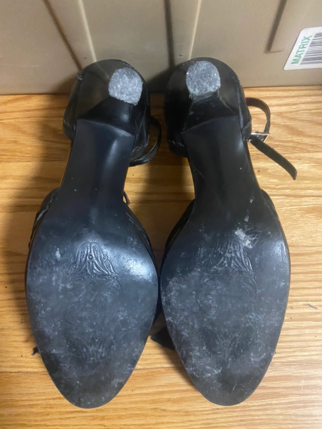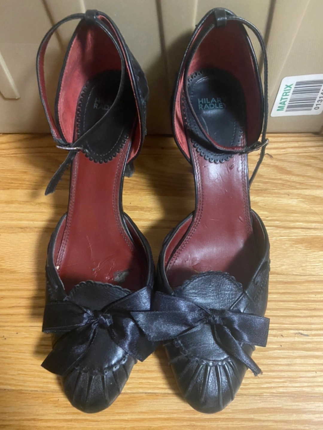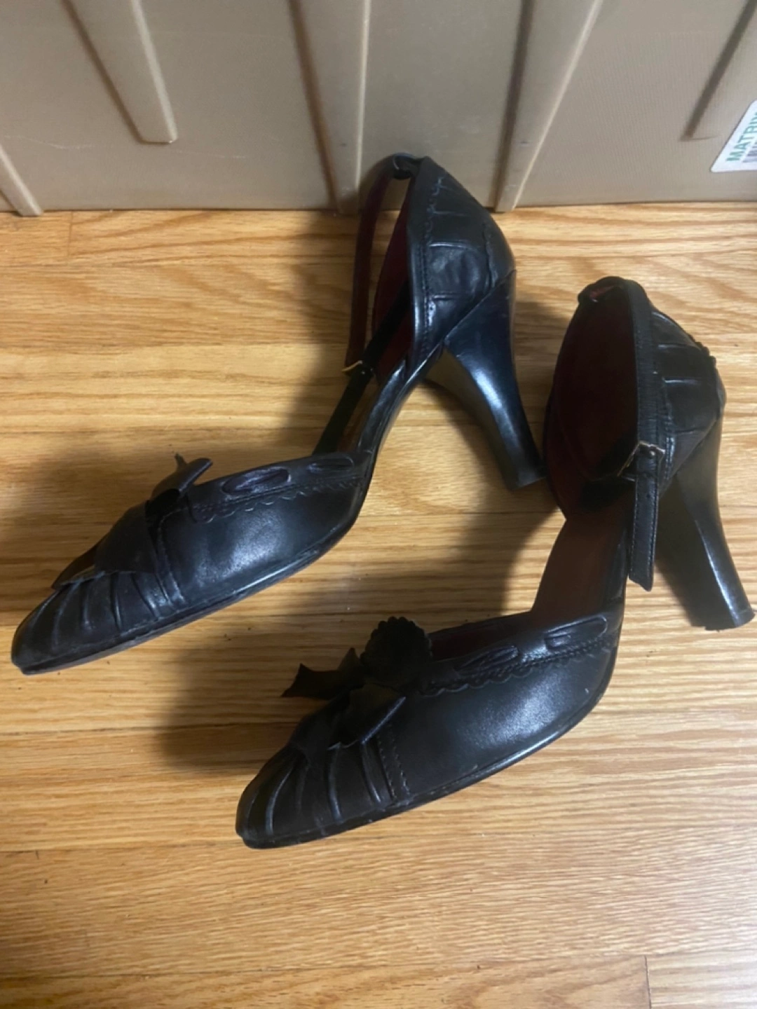 Black leather heeled shoes with ankle strap and a bow detail. The shoes have a small heel.