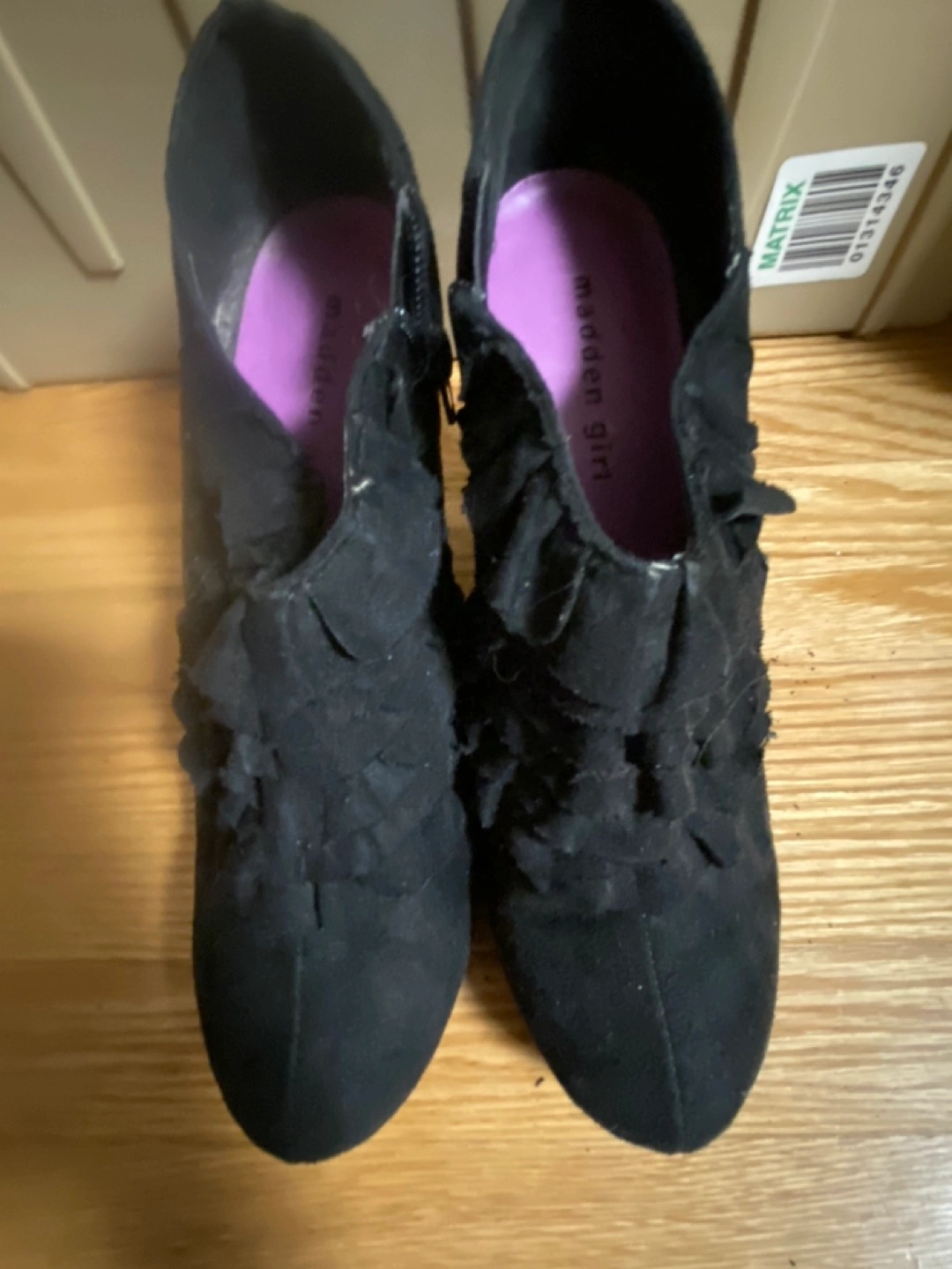 Black suede ankle boots with ruffles. Zip closure on the side. High heel.