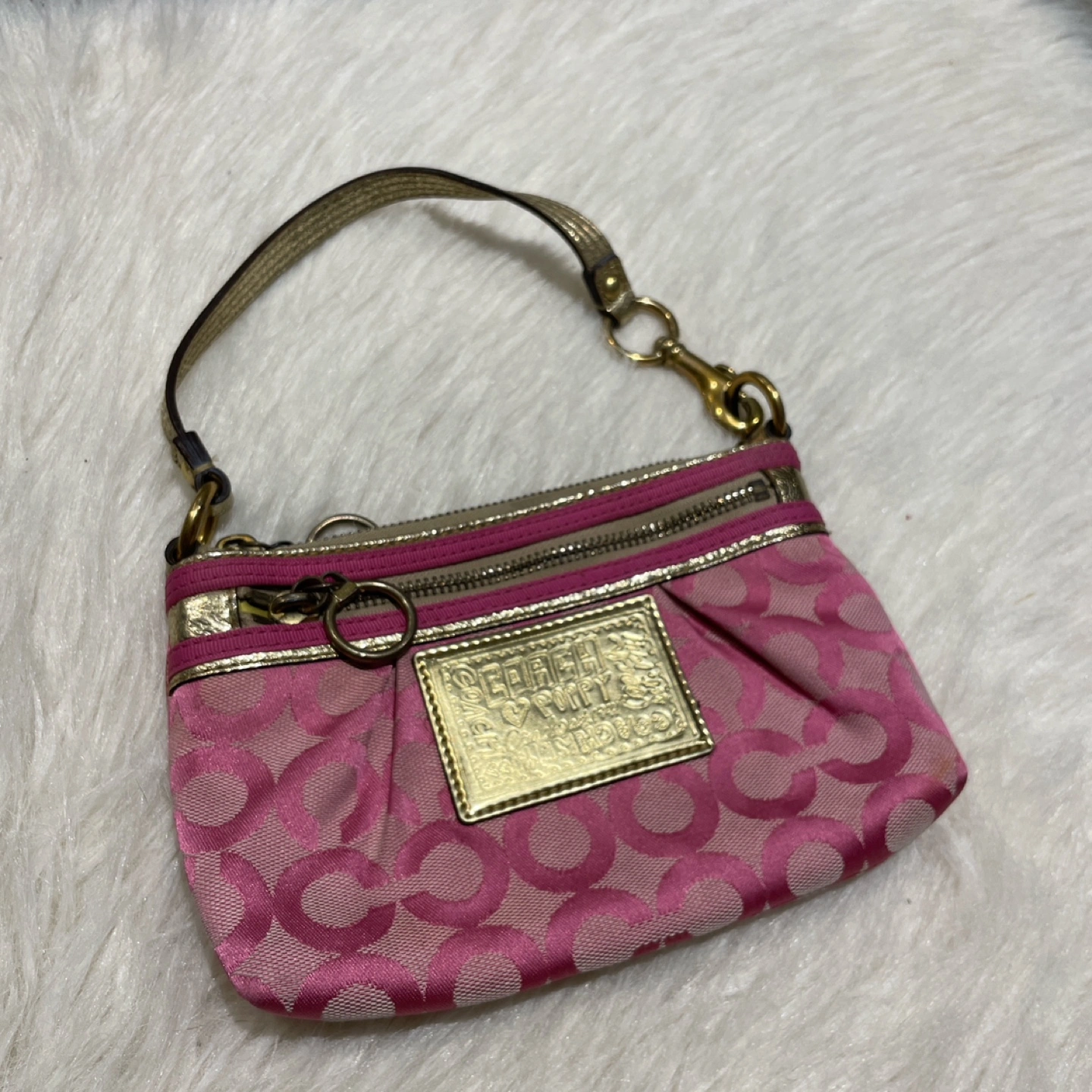 Small pink Coach handbag with gold accents. Has a zipper closure and an attached wrist strap.