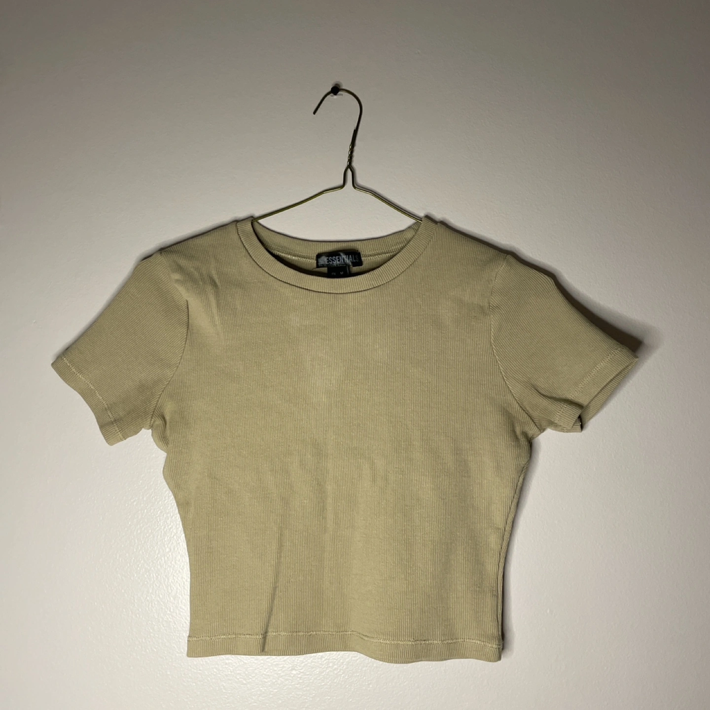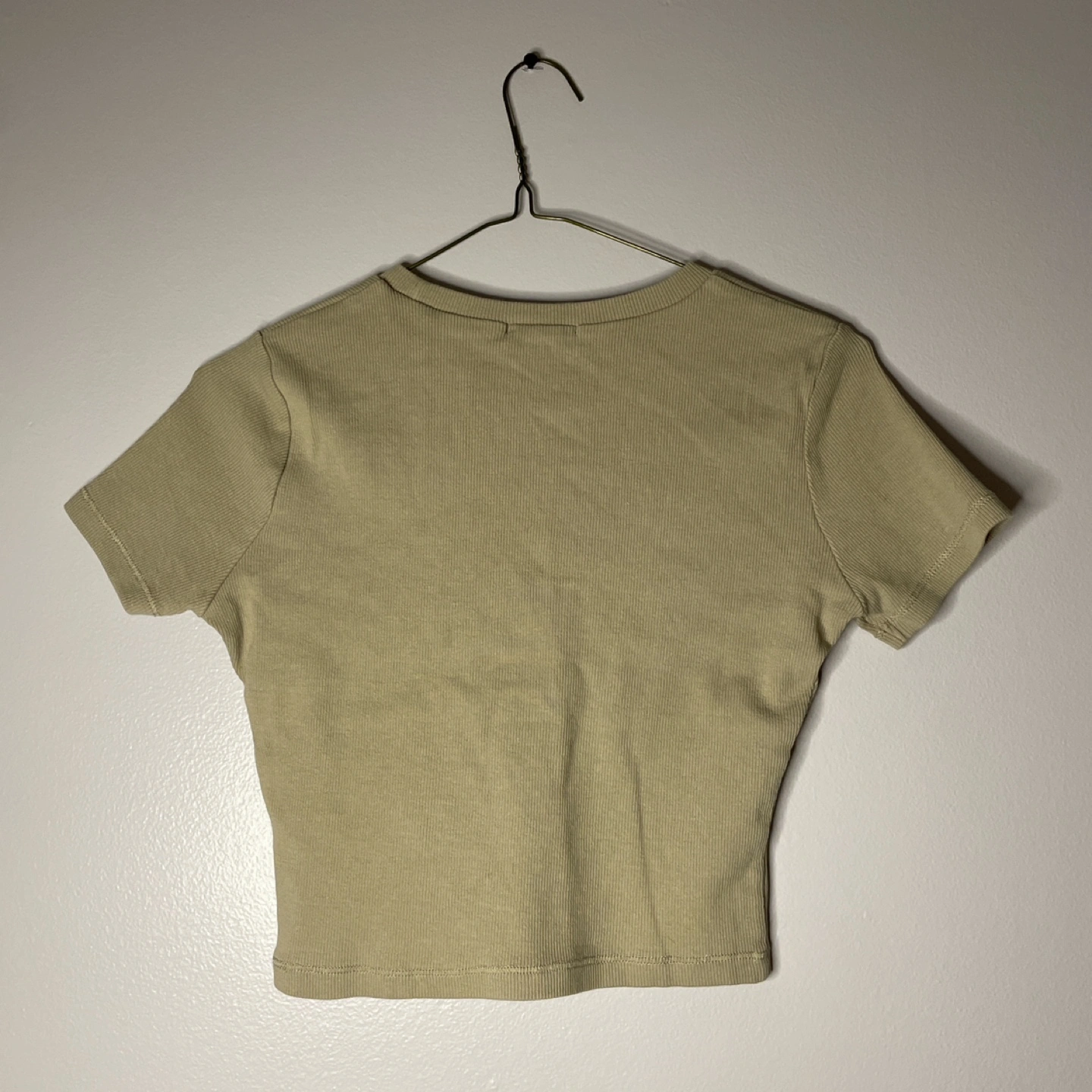 Short sleeve, beige, cropped t-shirt.