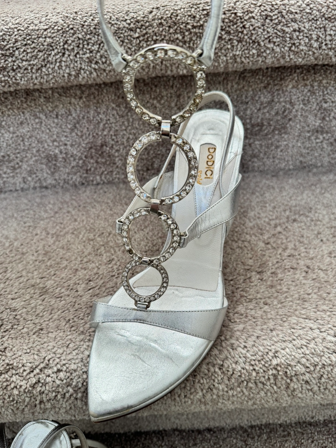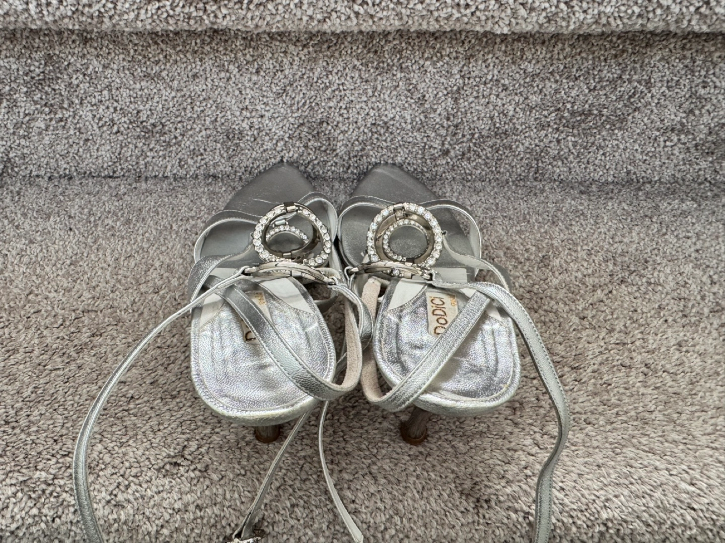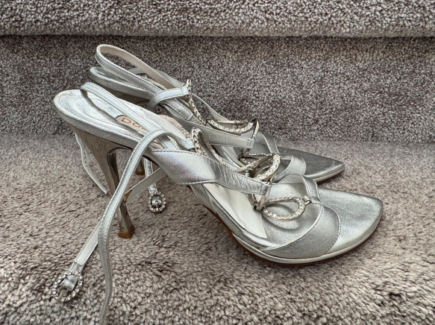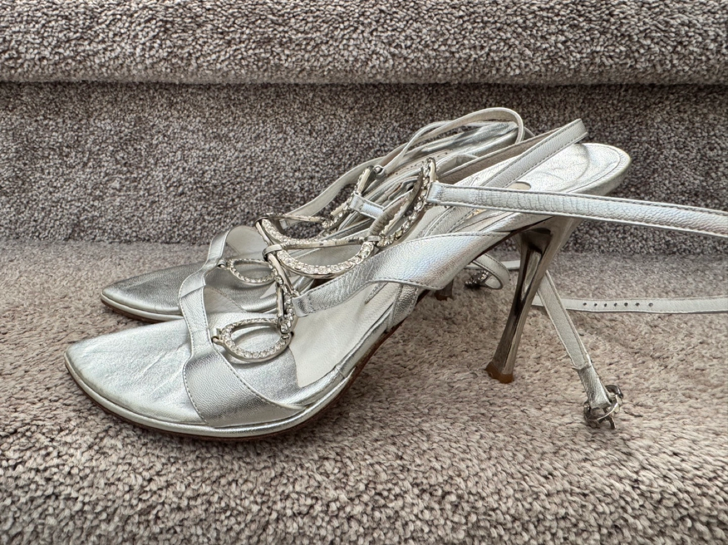 Silver, strappy sandals with rhinestones and a high heel. Size 8-8,5 (EU 39)