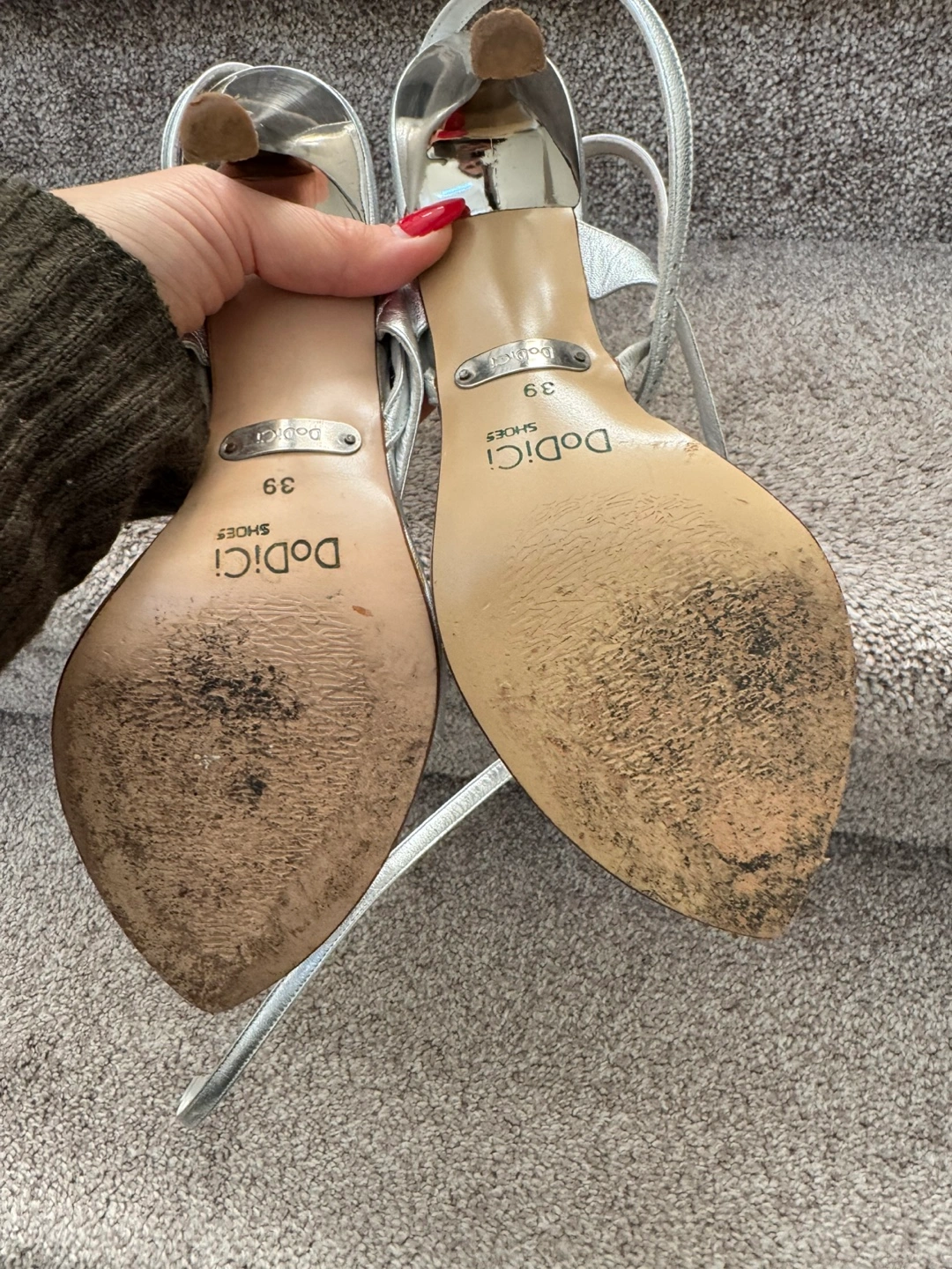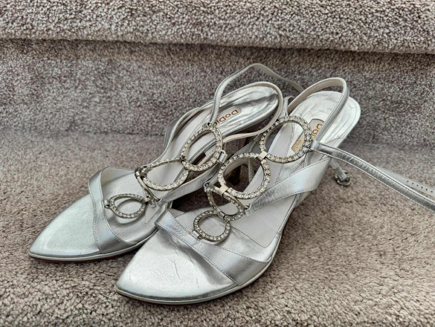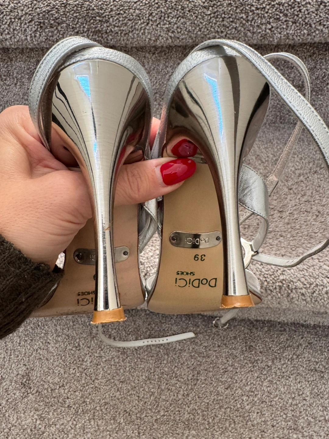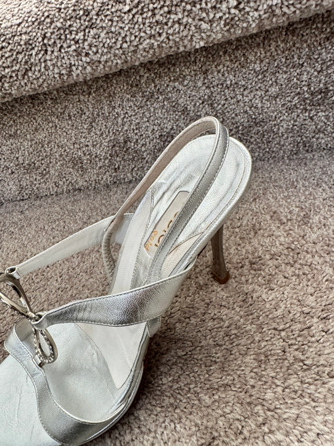 Silver, strappy sandals with rhinestones and a high heel. Size 8-8,5 (EU 39)