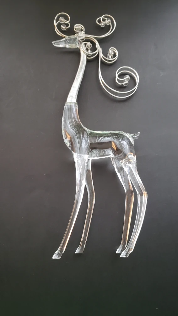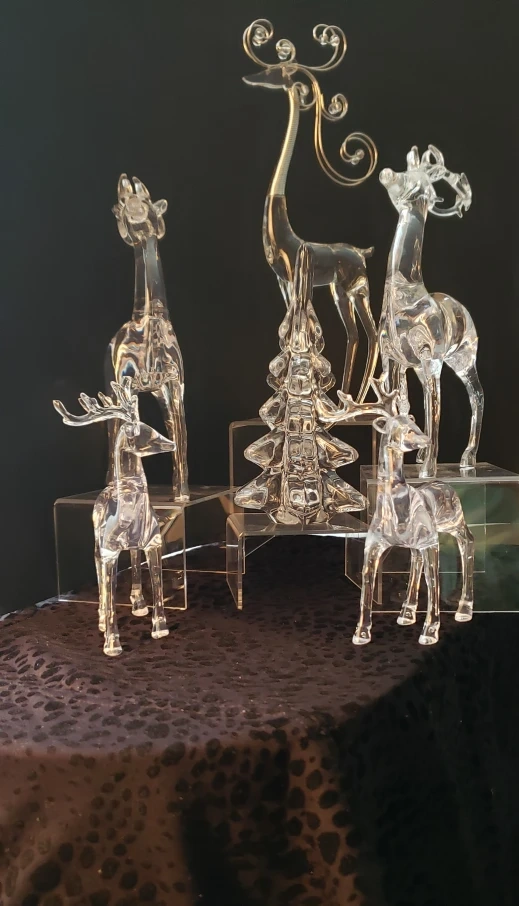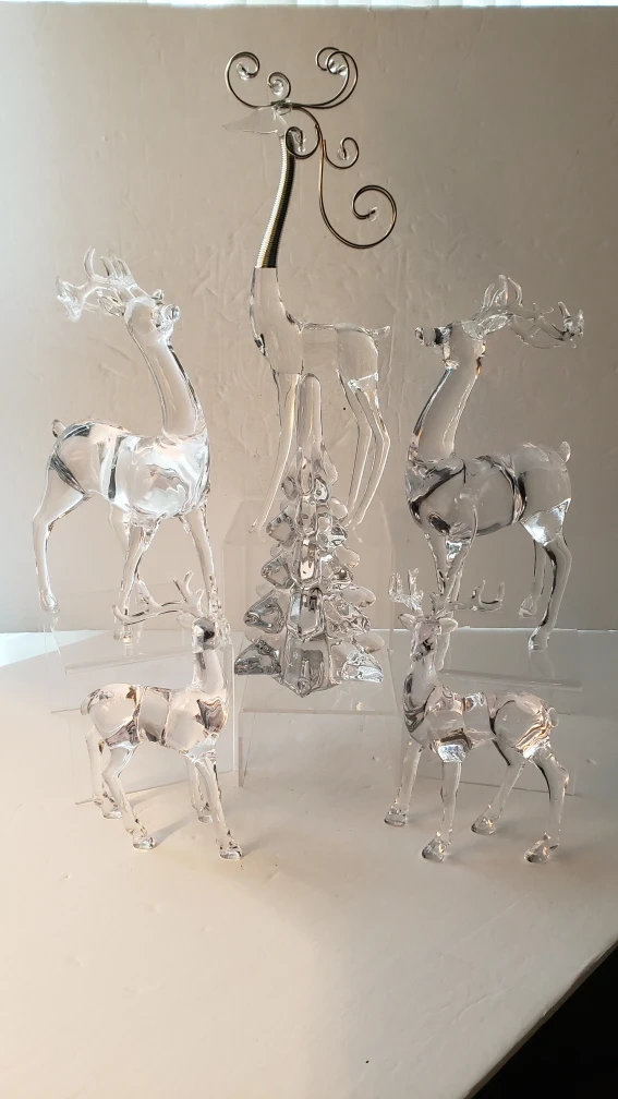 Set of 6 acrylic reindeer ornaments. Includes a tall reindeer with a decorative swirl on its neck, a small glass Christmas tree, and two medium size reindeer and two small.