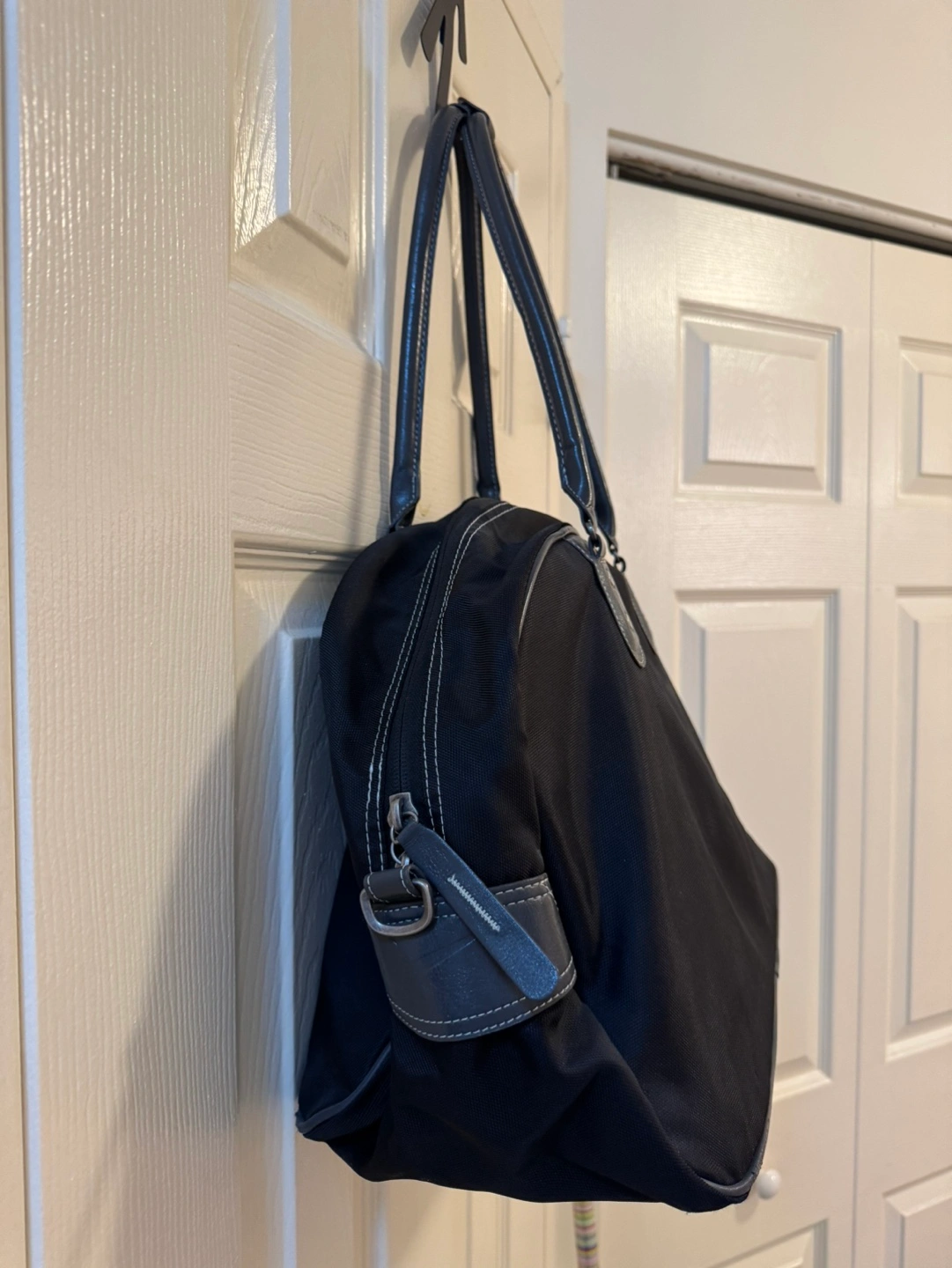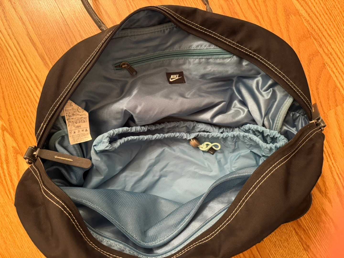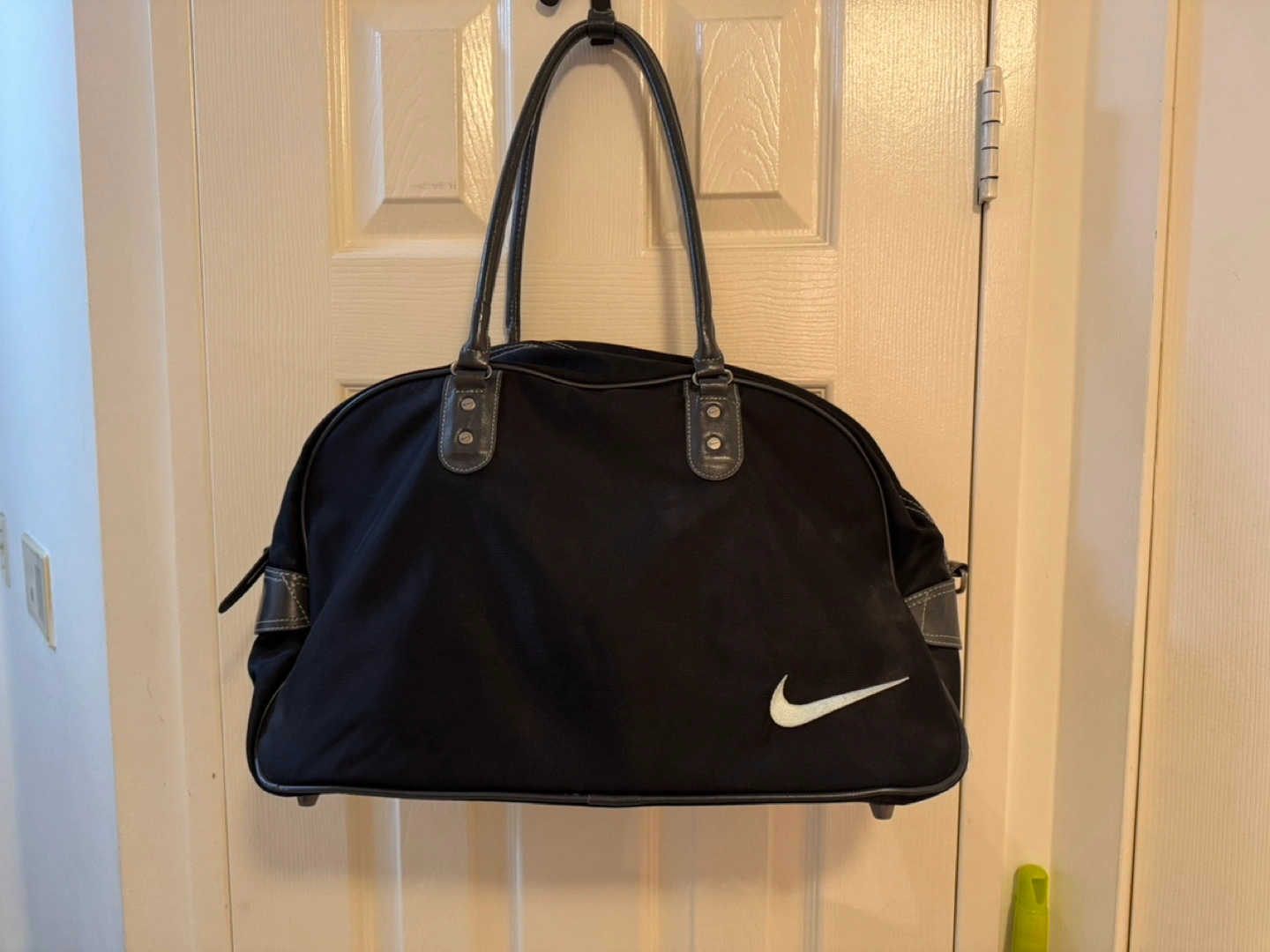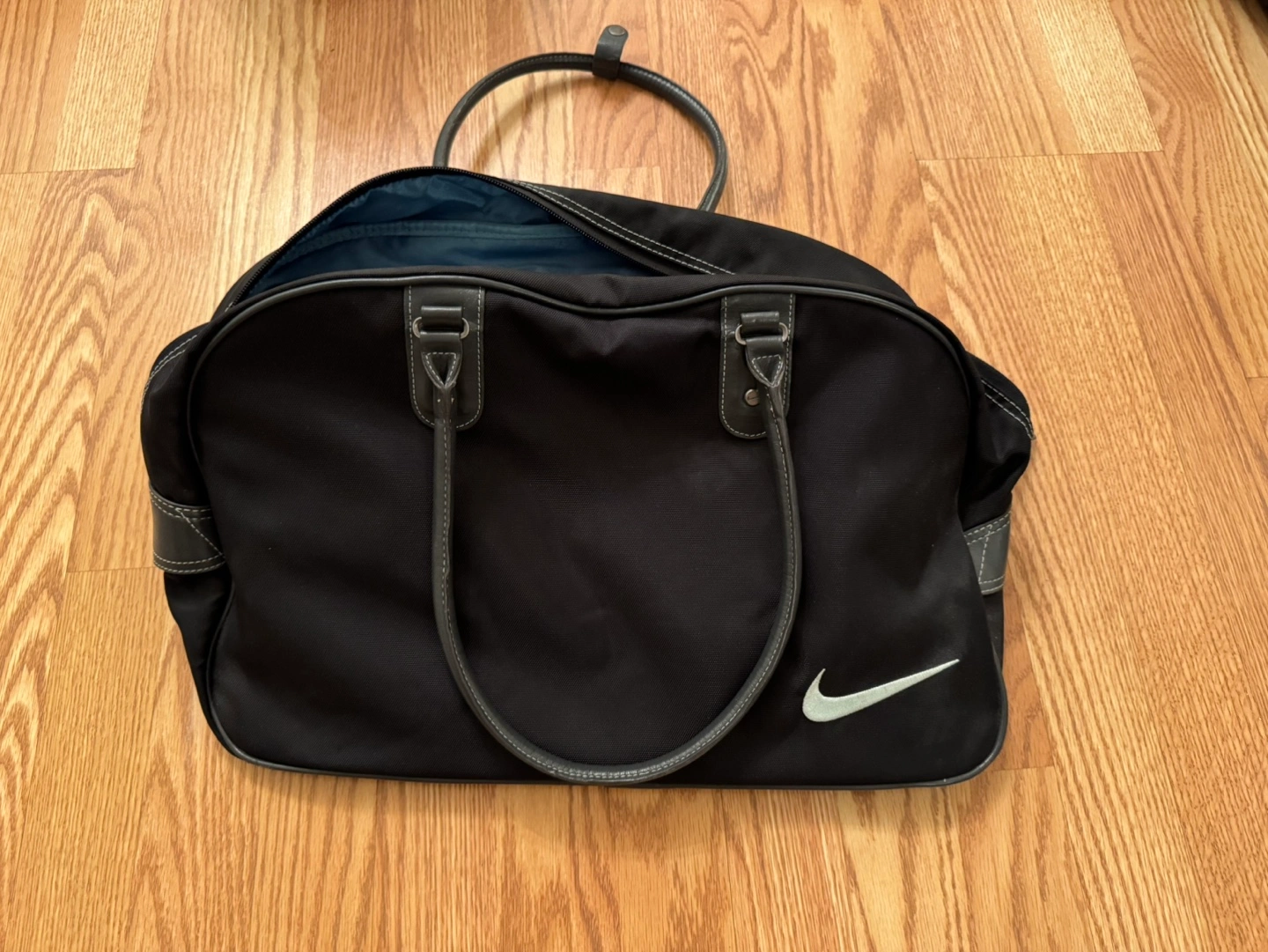 Black Nike travel bag with white logo and grey trim. Two top handles with a zippered closure. Interior has a zippered pocket and a pouch with a drawstring. Pick up: Bay/College Cash only. No delivery and e-transfer