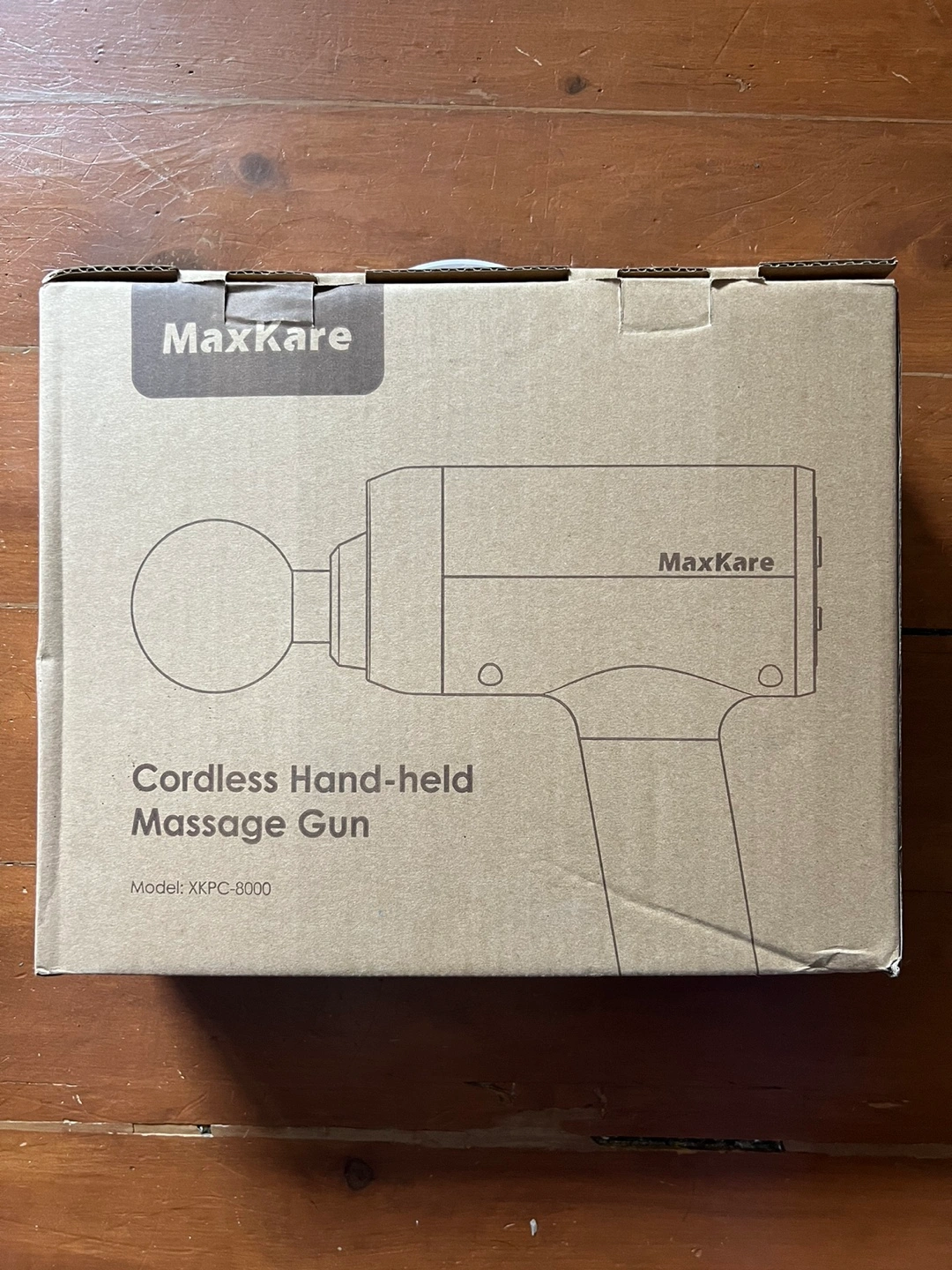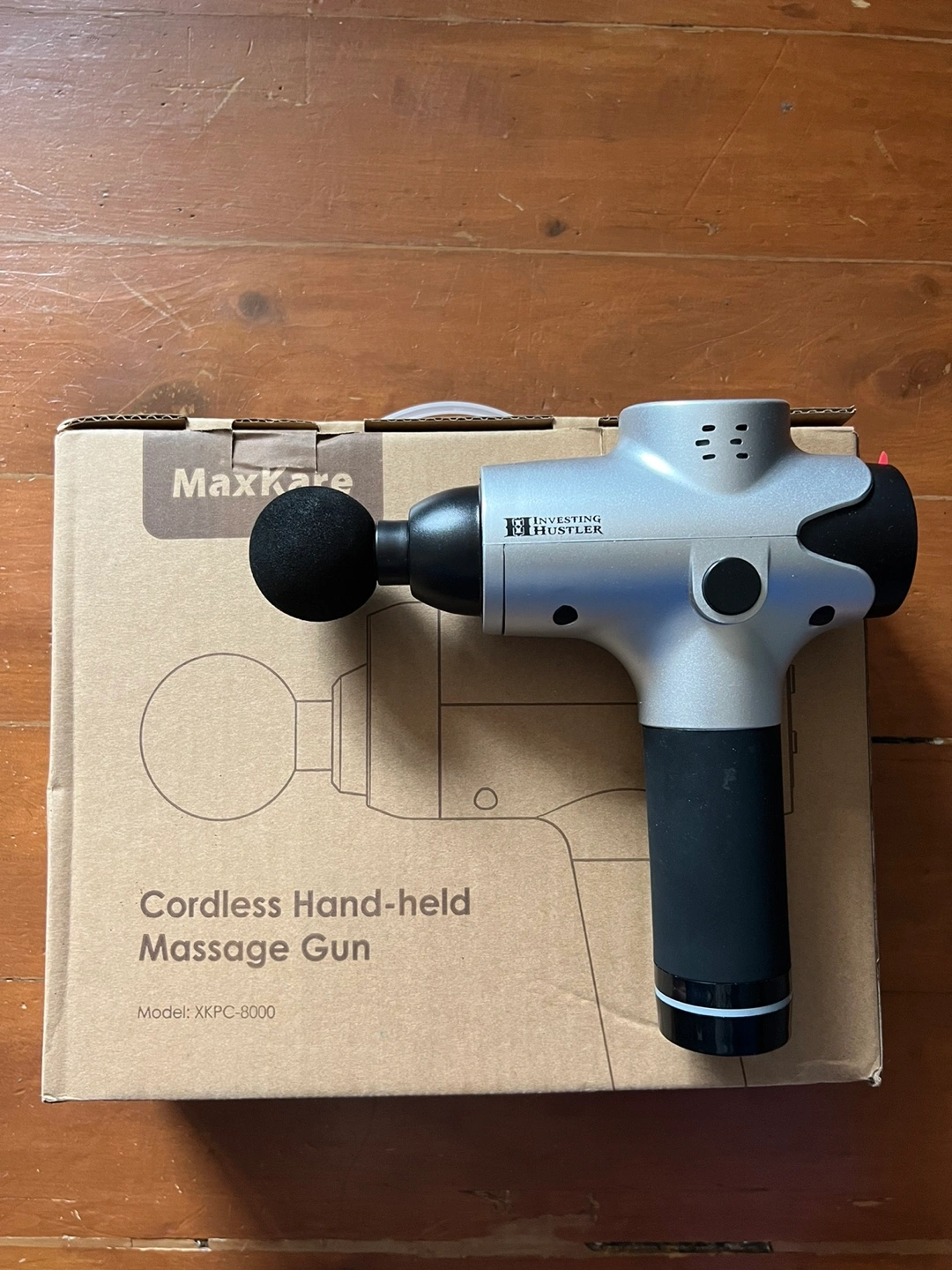 Cordless handheld massage gun. Model: XKPC-8000. Includes multiple attachments.