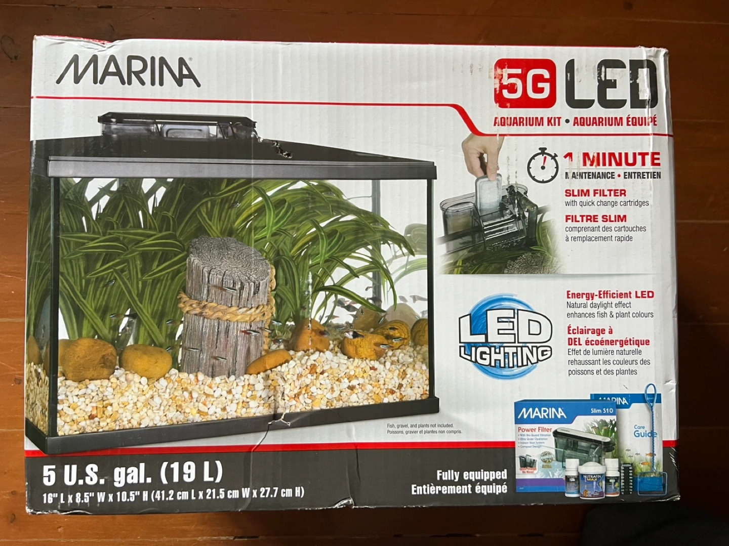 5 US gallon aquarium kit with LED lighting. Includes filter and care guide. Fully equipped.
