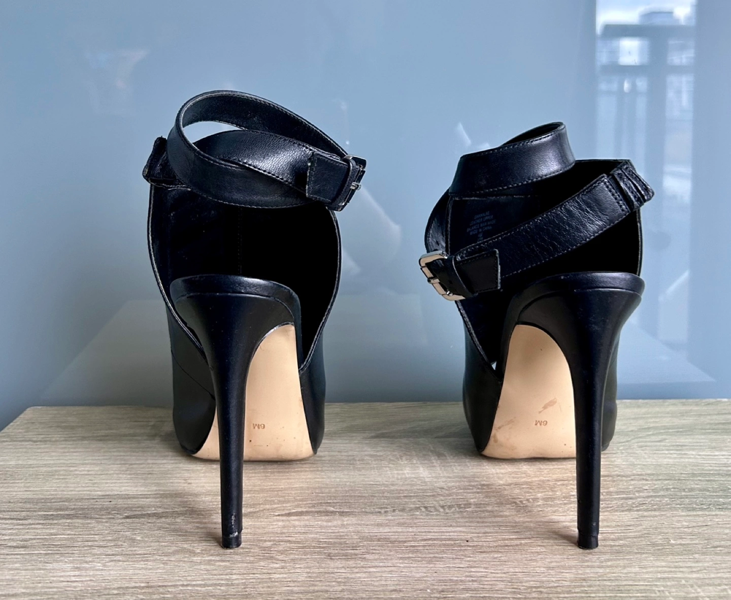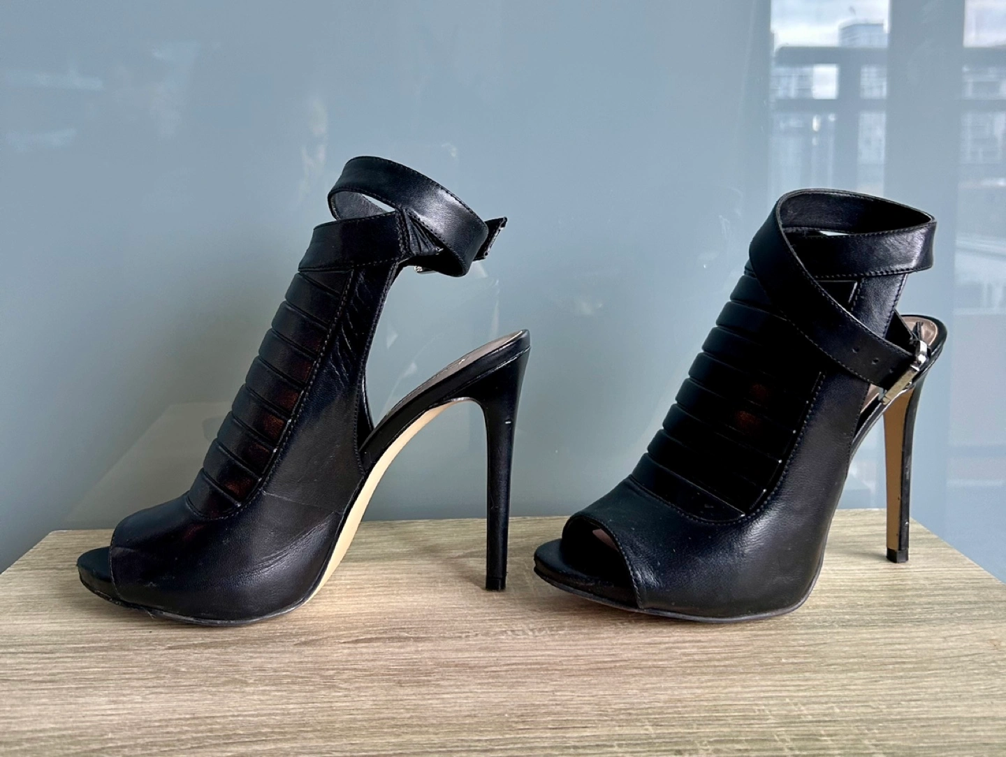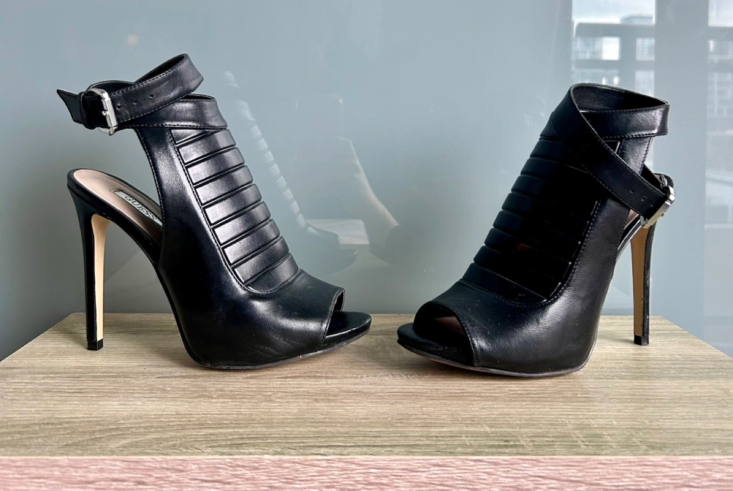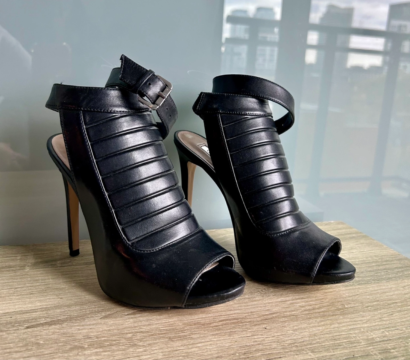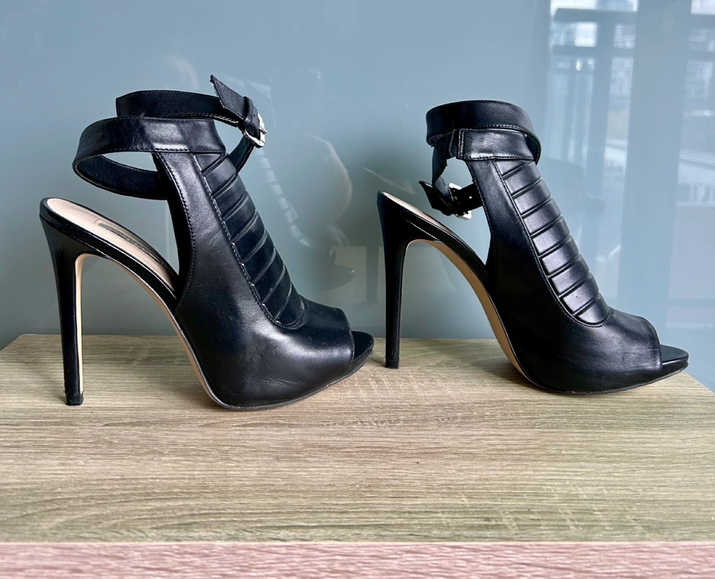 Guess leather gladiator heels! Size 6 ๐ These comfortable, sturdy heels make a statement piece. They make any outfit look hot while worn with jeans, tights, skirts, or dresses etc. Very versatile look and can be worn casual or dressed up.