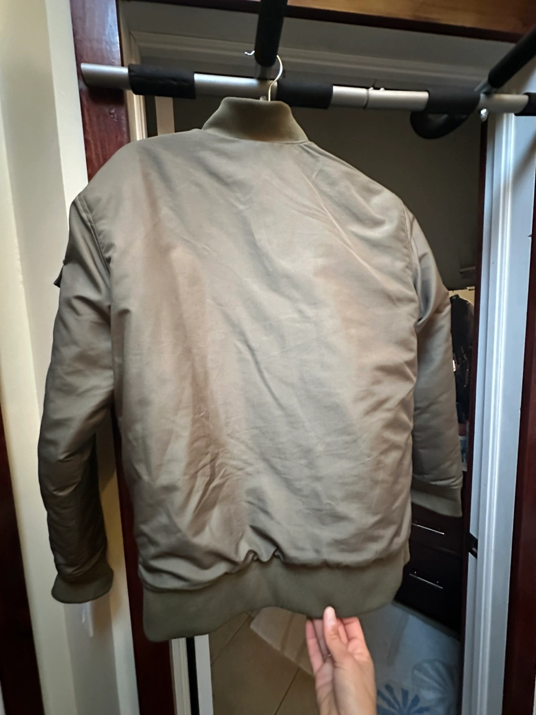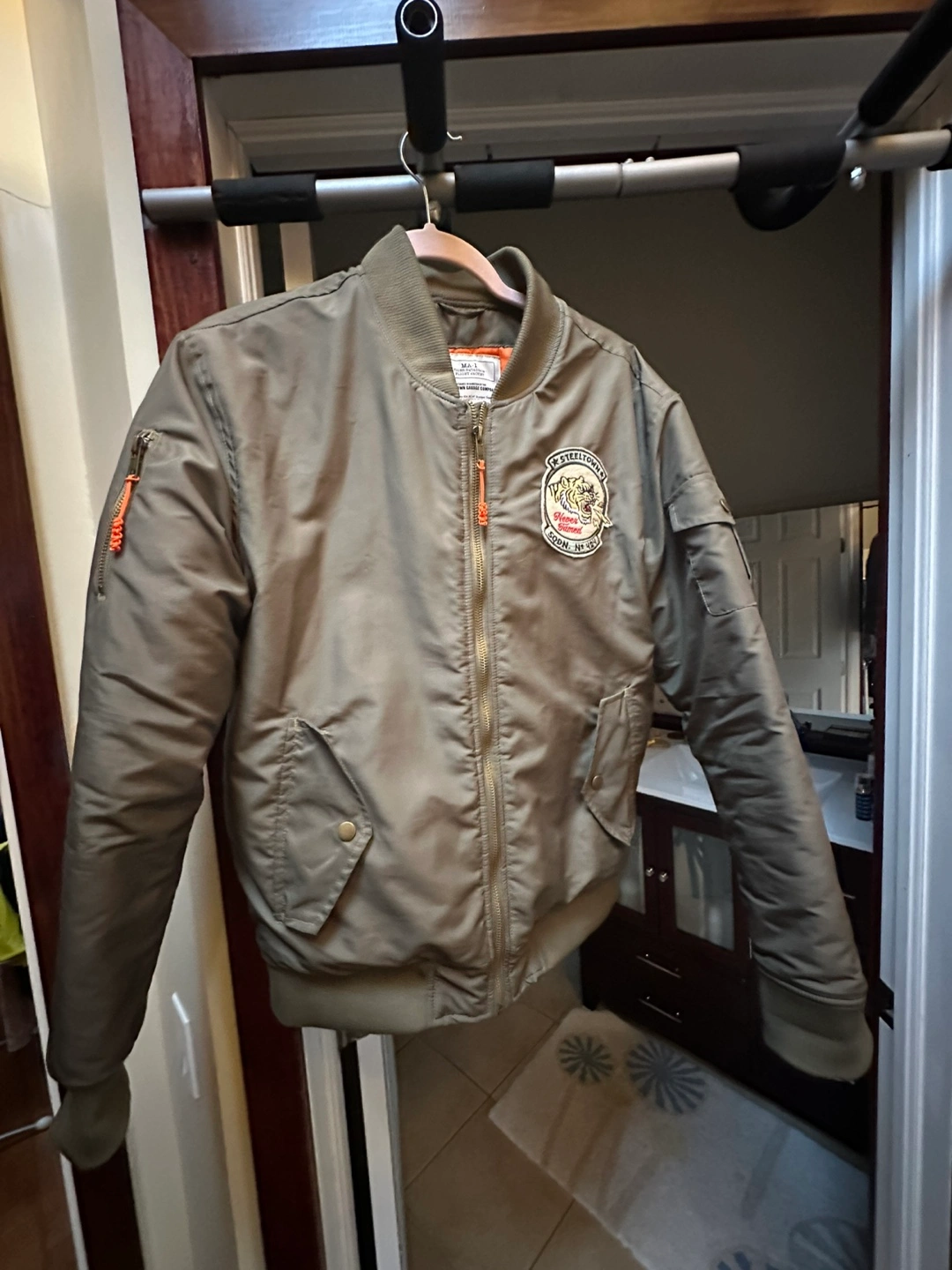 Green bomber jacket with an orange tiger patch on the left side. Has a zipper closure and two zippered pockets. It’s from a cute shop in Hamilton https://steeltowngarage.com/