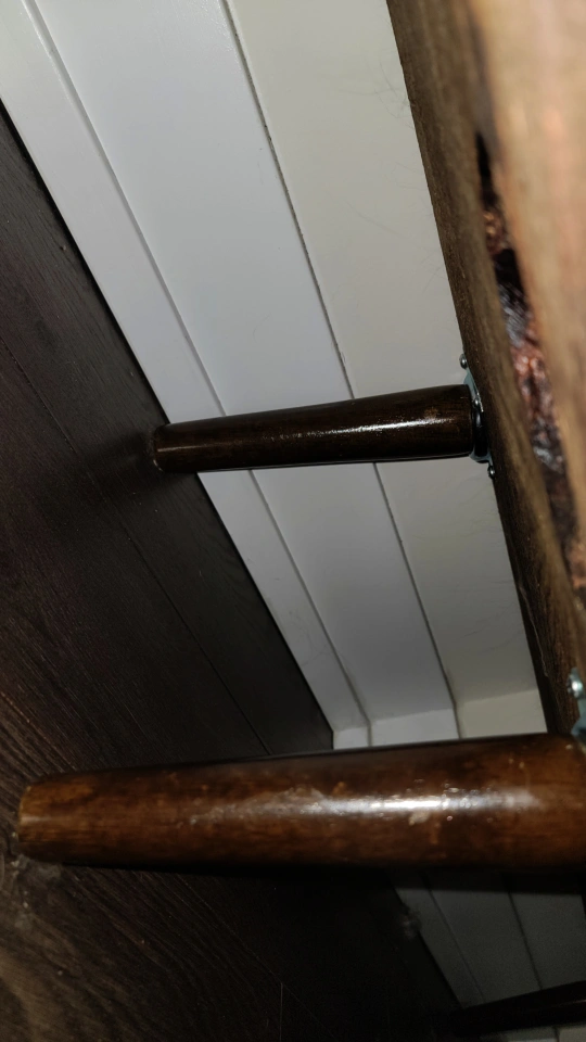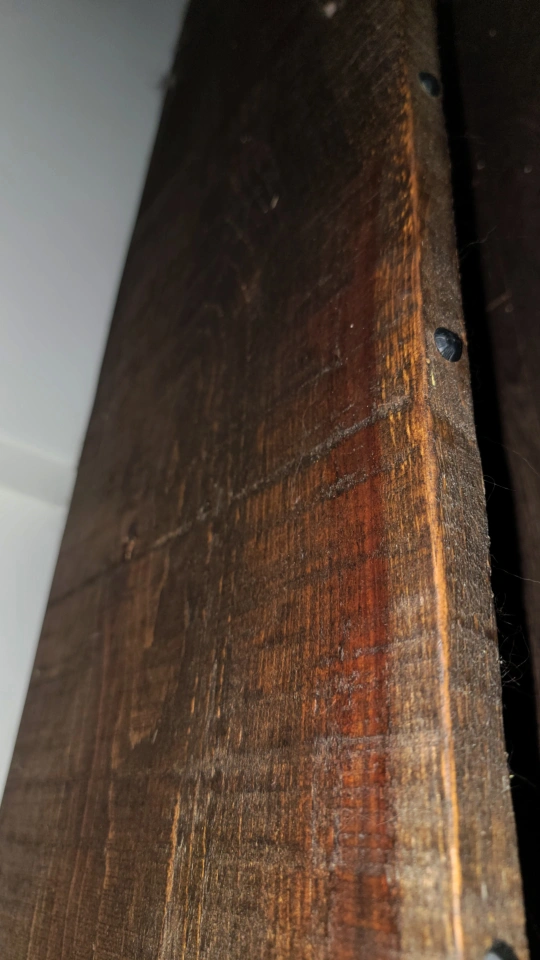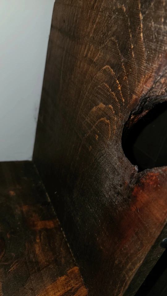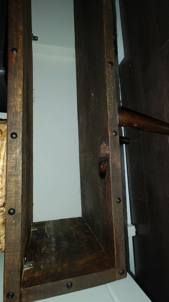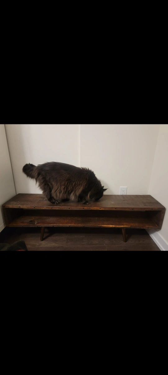 Wooden TV Stand with a shelf. Has metal studded accents. The legs are mid-century modern style. Hand made live edge stand for multiple uses around the home Can be restained or repainted to your liking! XL chubby cat for scale 😹 (sizing) Delivery avail for small fee in GTA