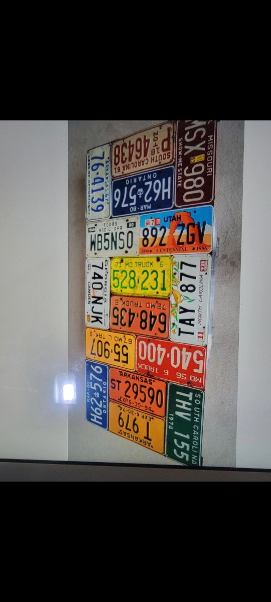 Unique coffee table made with a variety of (real) old vintage license plates. Metal frame. Very uncommon statement piece perfect for man cave 💥 or vintage lover Avail for delivery for small fee