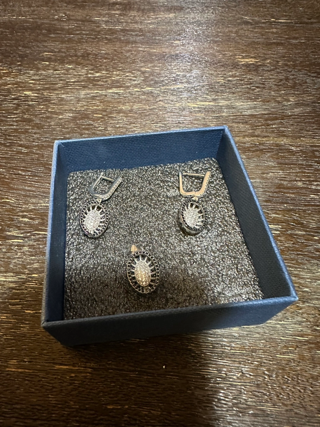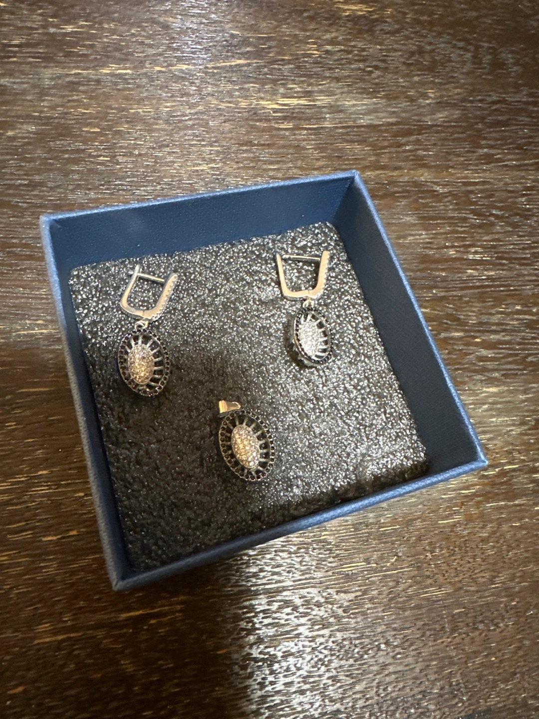 Set of earrings and a pendant. Oval-shaped with black stones.