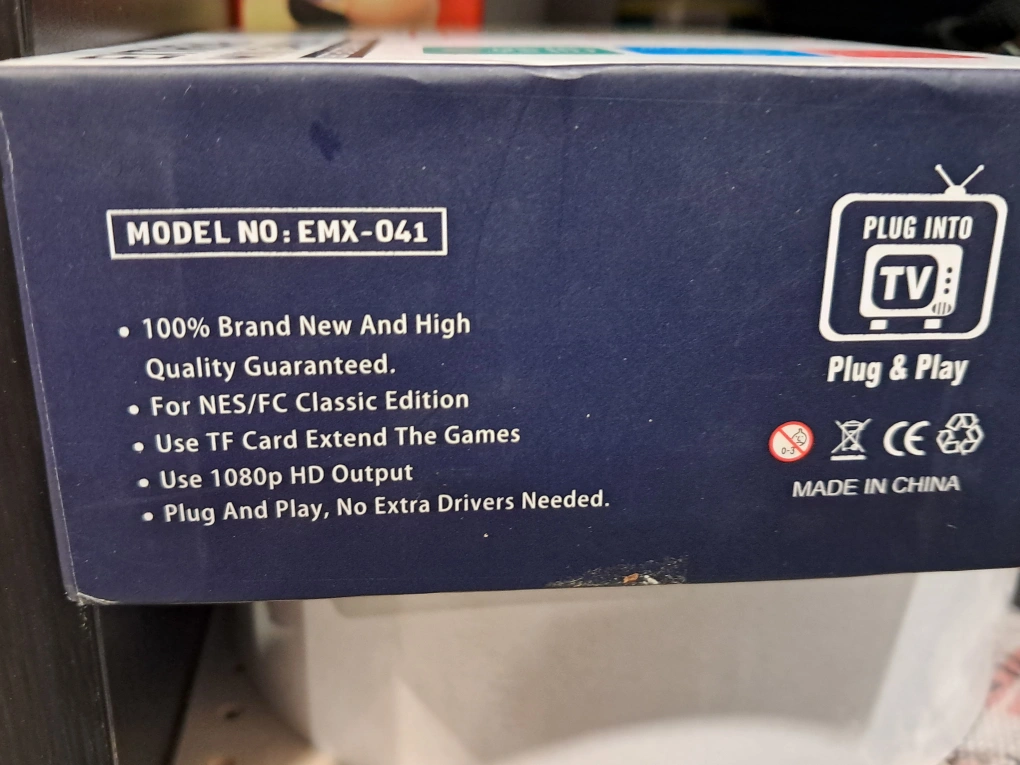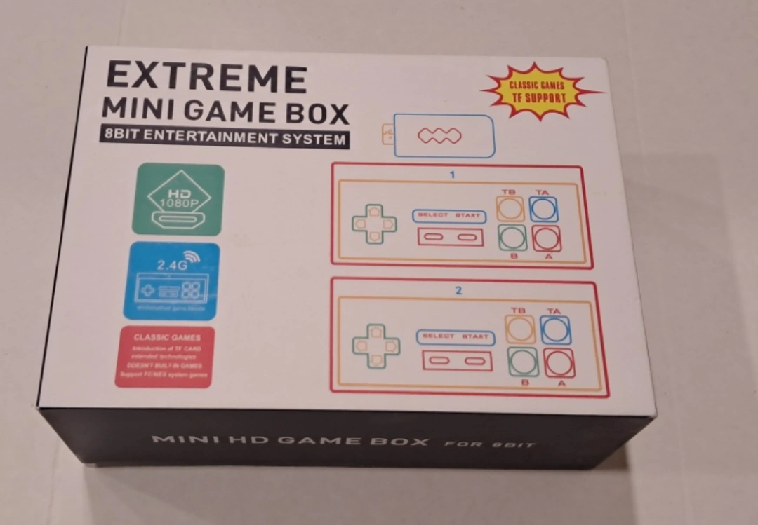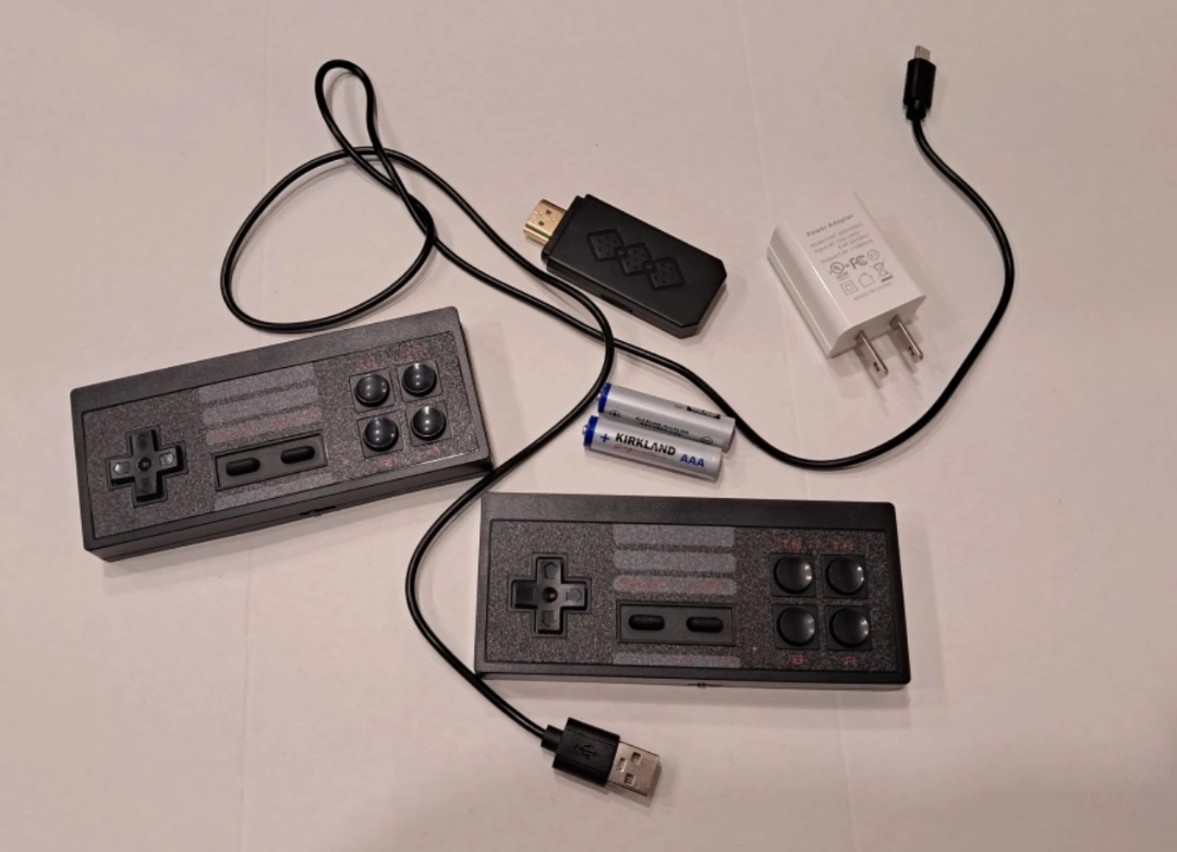 8-bit game console with two wireless controllers. Includes HDMI cable and power adapter. Plays NES/FC games.