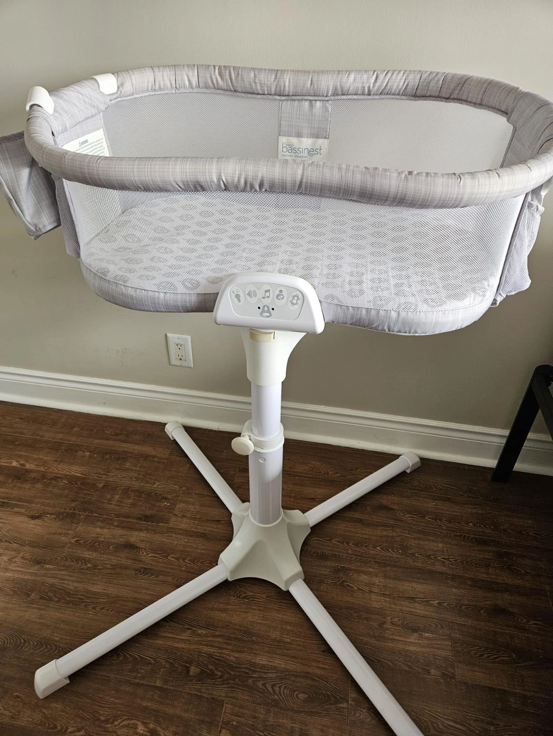Grey and white halo bassinet with stand. Features a side pocket, music player, and vibration.