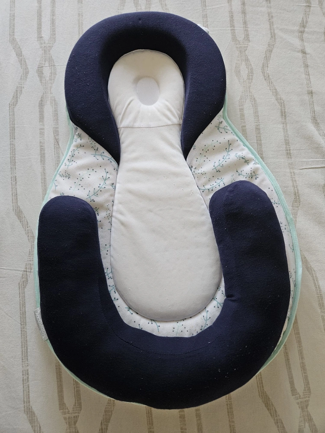 Baby pillow with a navy blue outer layer and white inner layer. The pillow is shaped like a U and has a small removable pillow in the center.