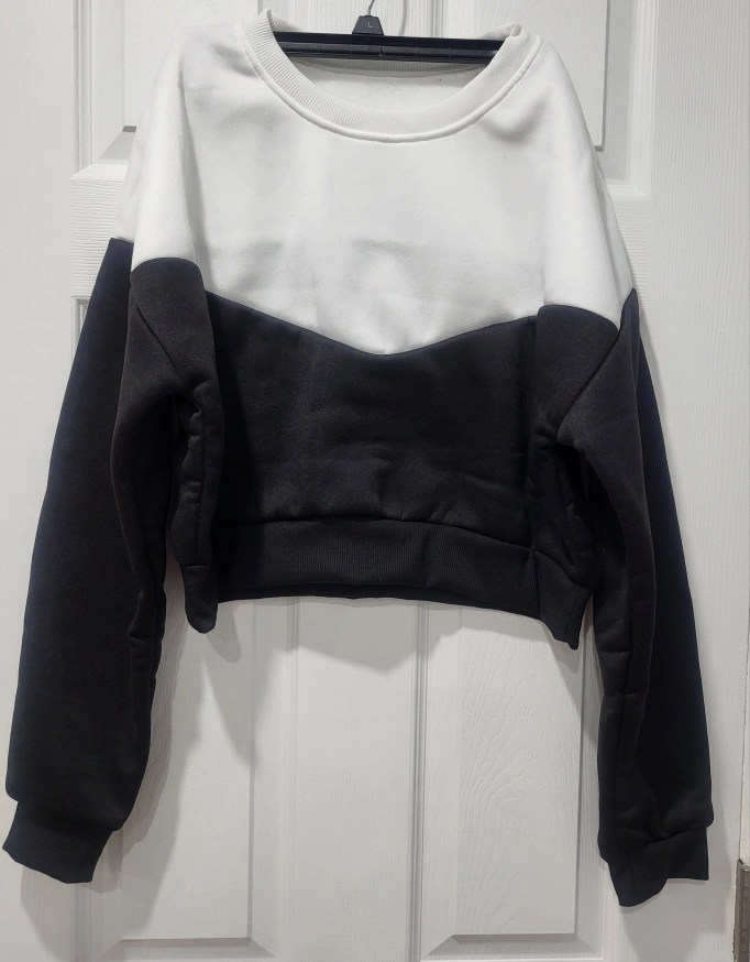 Long-sleeved, black and white cropped sweatshirt. Crew neck. 100% Polyester SUMMER SALE...BUY WORTH $20 GET FREEBIES WORTH $5.