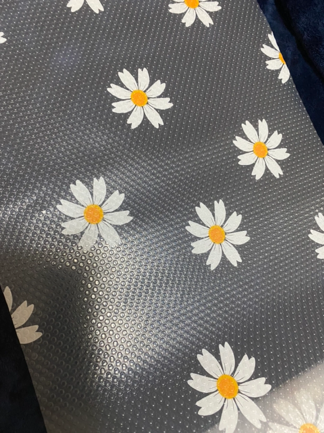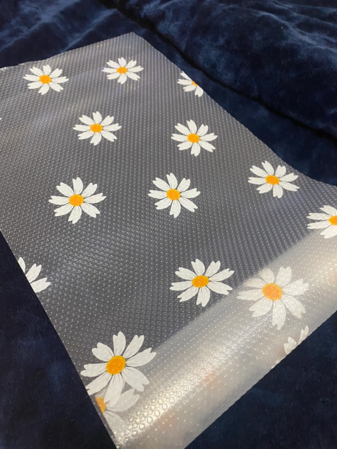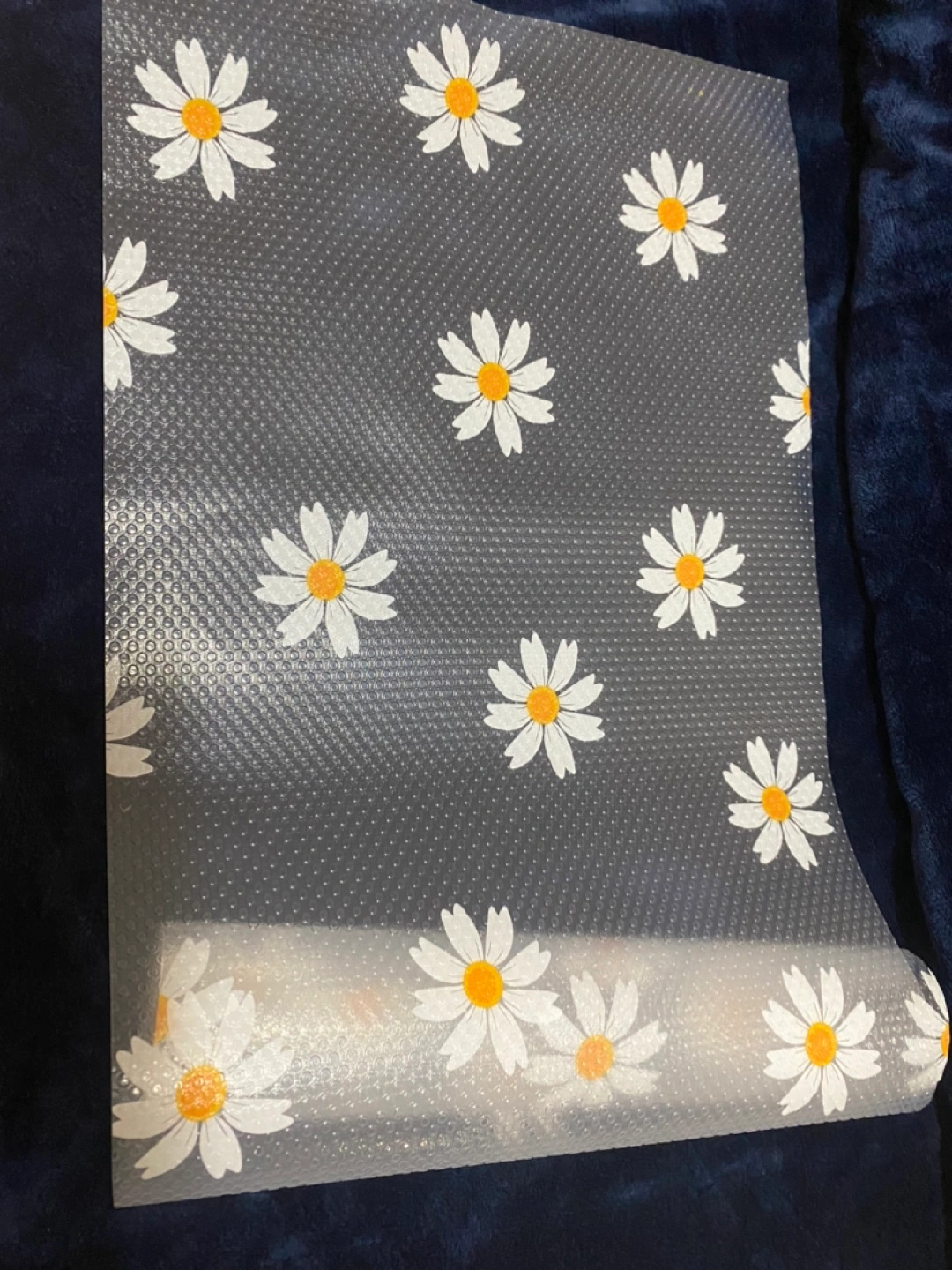 Waterproof and Anti-dust Coating, Non-slip mat with a daisy print. Great for counters, drawers, shelves, and cupboards.