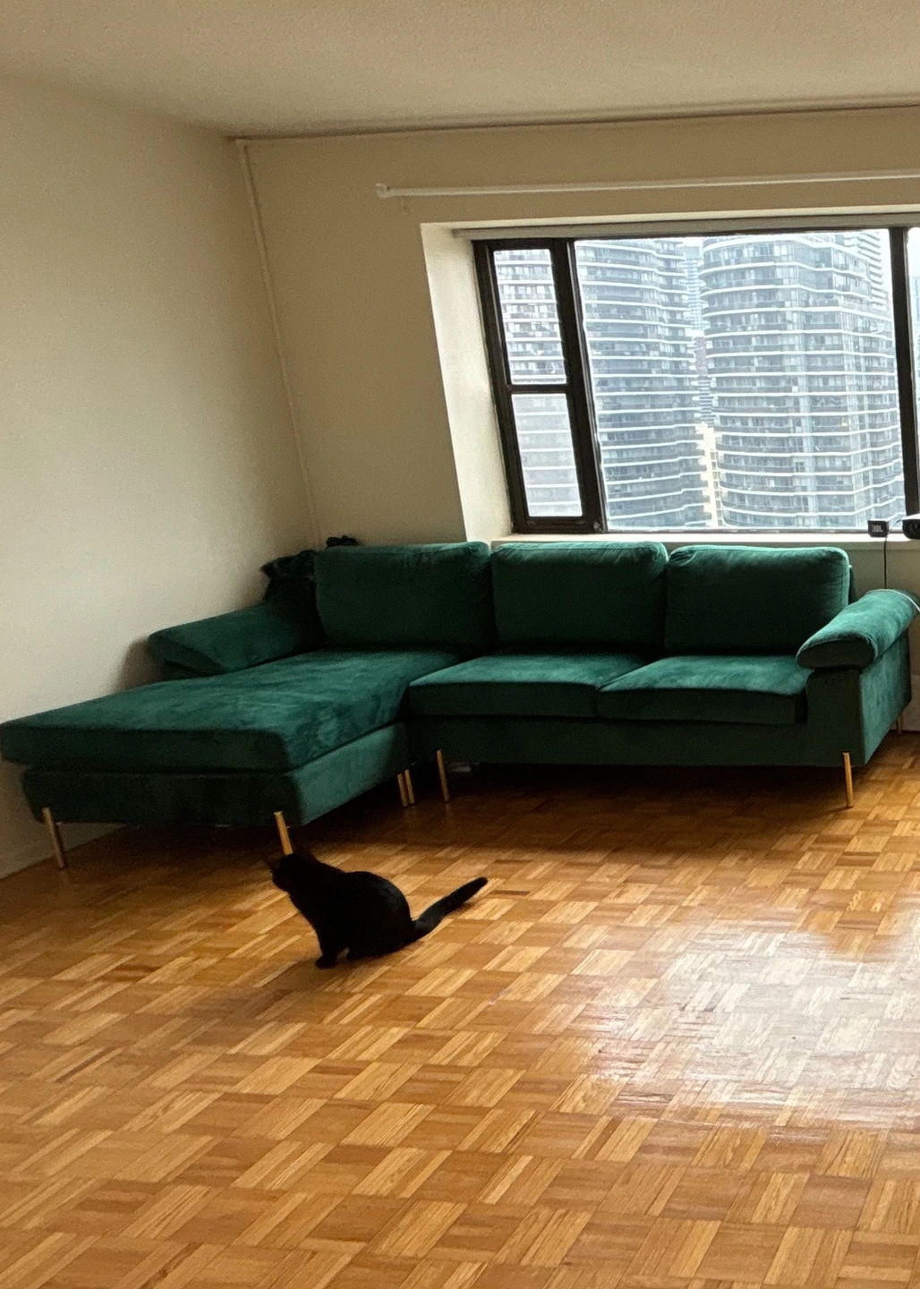 Green velvet sectional sofa with gold legs. comes with two pillow covers + two small christmas pillows from dollarama inside Comes from a cat household but no scratches or damage Link to Couch info : https://www.wayfair.ca/furniture/pdp/mercer41-velvet-sectional-sofa-with-chaise-c100755575.html Couch off of Wayfair - Saidel 2 - piece velvet sectional $275 if you come and buy it monday the 13