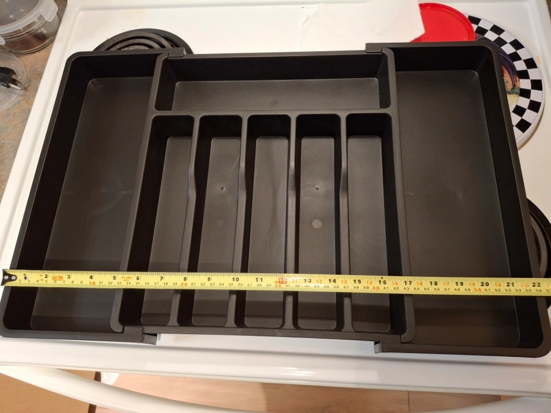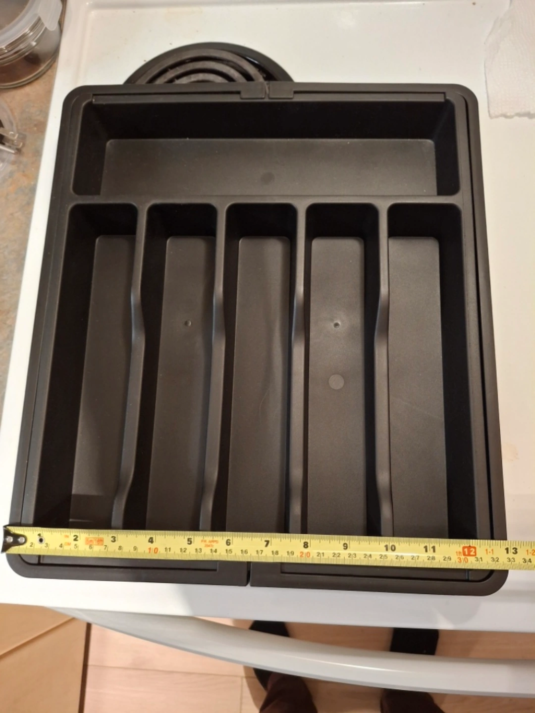 Black utensil organizer, can extend to 22 inches wide. Never used as it was too big for my drawer.
