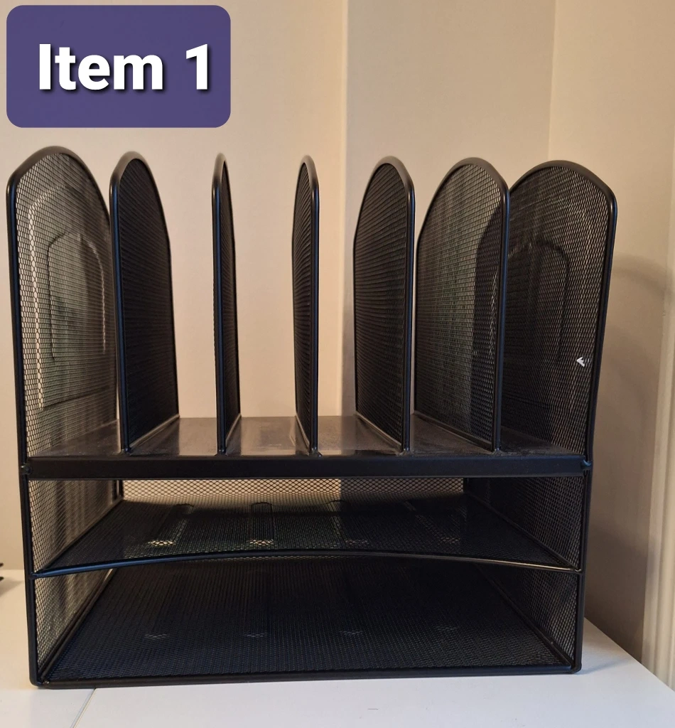 *PLEASE CONTACT ME ONLY TO PICK UP* Hardly used, strong Metal Mesh desk organizers for a fraction of actual price: SOLD!!! ITEM #1- File and paper organizers with 2 horizontal and 6 vertical slots. Holds a lot of files! Height - 13 inch Length - 13 inch Width - 11 inch Price $15.00 ITEM #2 Multi slot pen and stationery organizer and Pen Holder. Price $10.00 ***OR TAKE EVERYTHING FOR $20.00*** Pickup - Heartland Centre or Erin Mills Centre in Mississauga. Very Clean smoke-free, pet-free home. Please check my other listing, lots of good stuff going cheap!