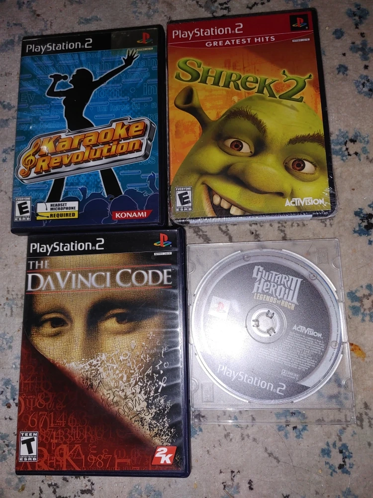 Lot of four PlayStation 2 games: Karaoke Revolution, Shrek 2, The Da Vinci Code, and Guitar Hero 3