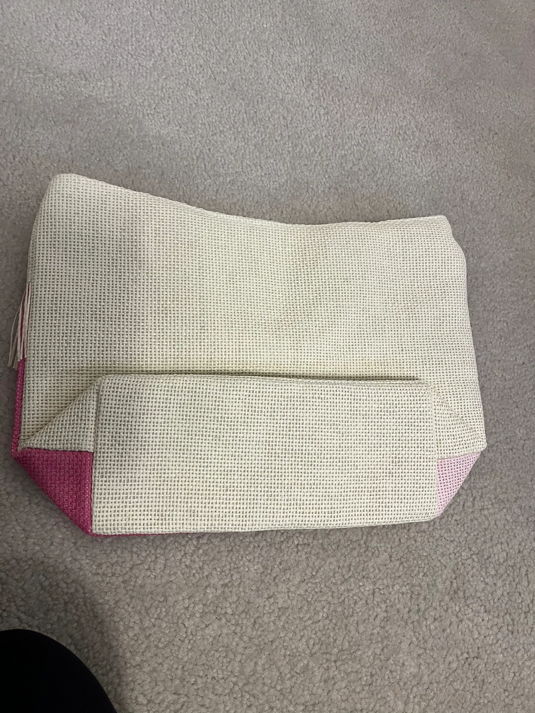 Pink and white tote bag with wooden handles, sequin flower detail and fringe trim.