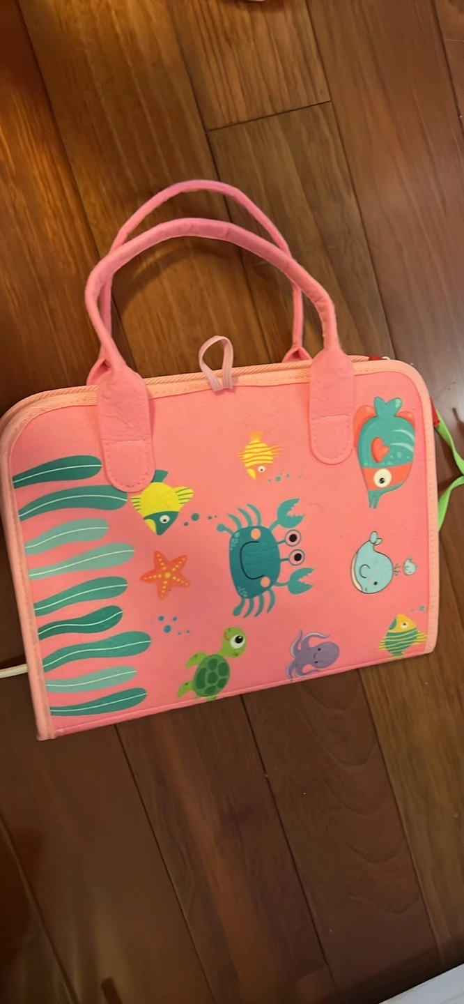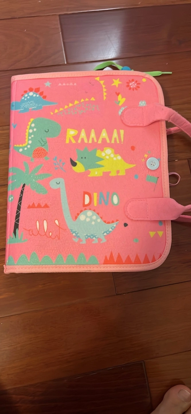Quiet book with different activities, including a zipper, buttons, shoelaces, buckles, and a counting abacus.