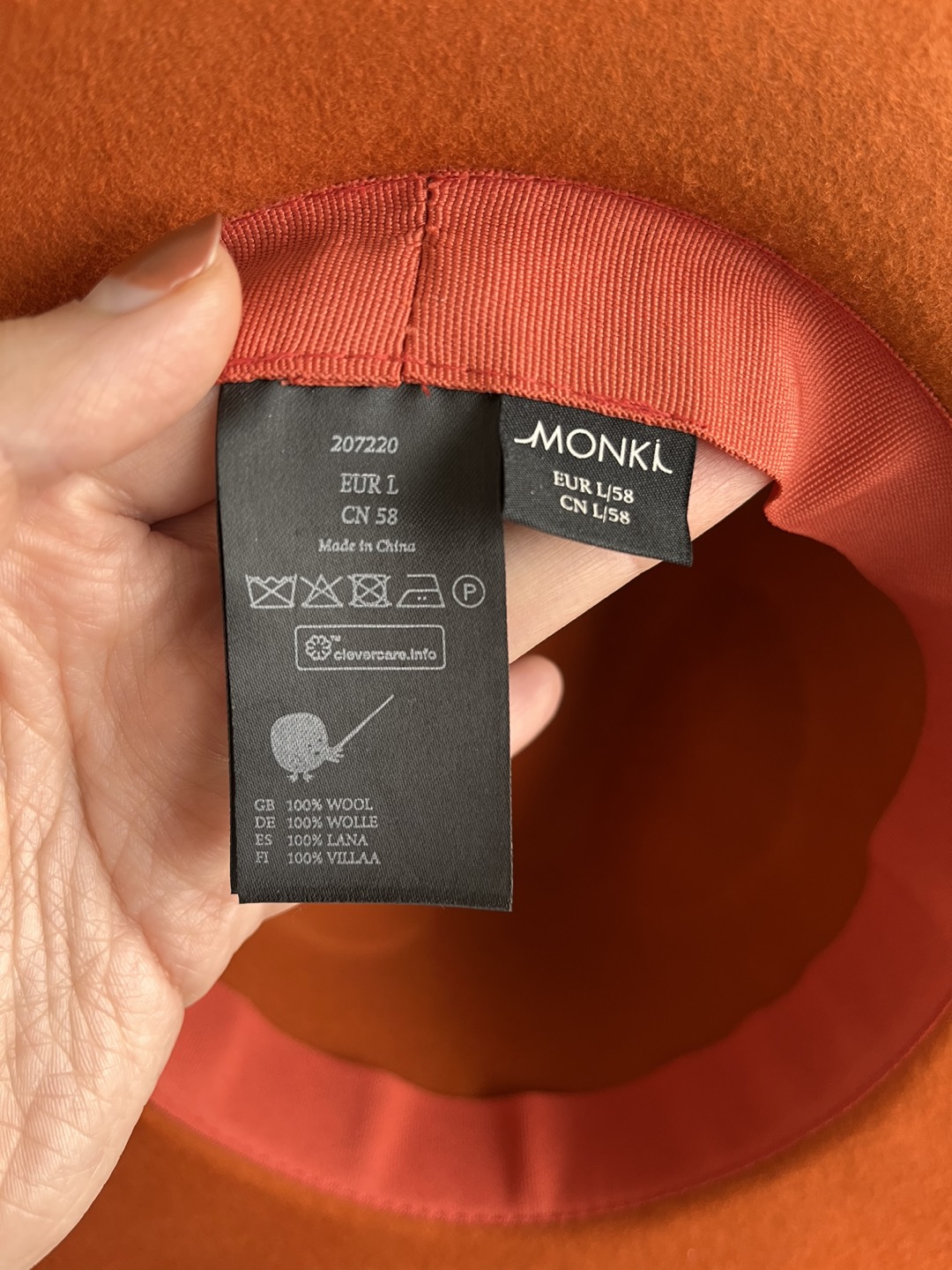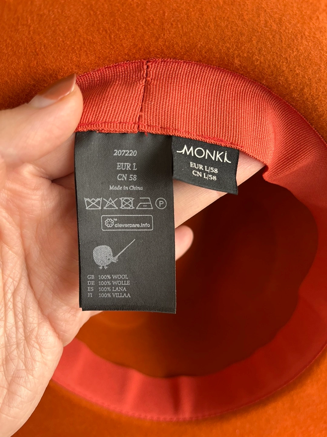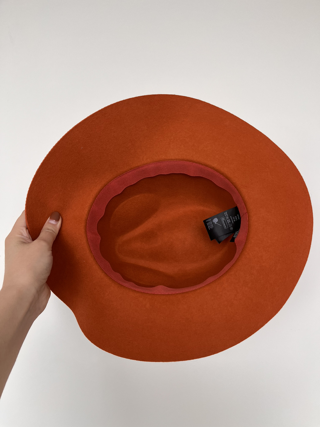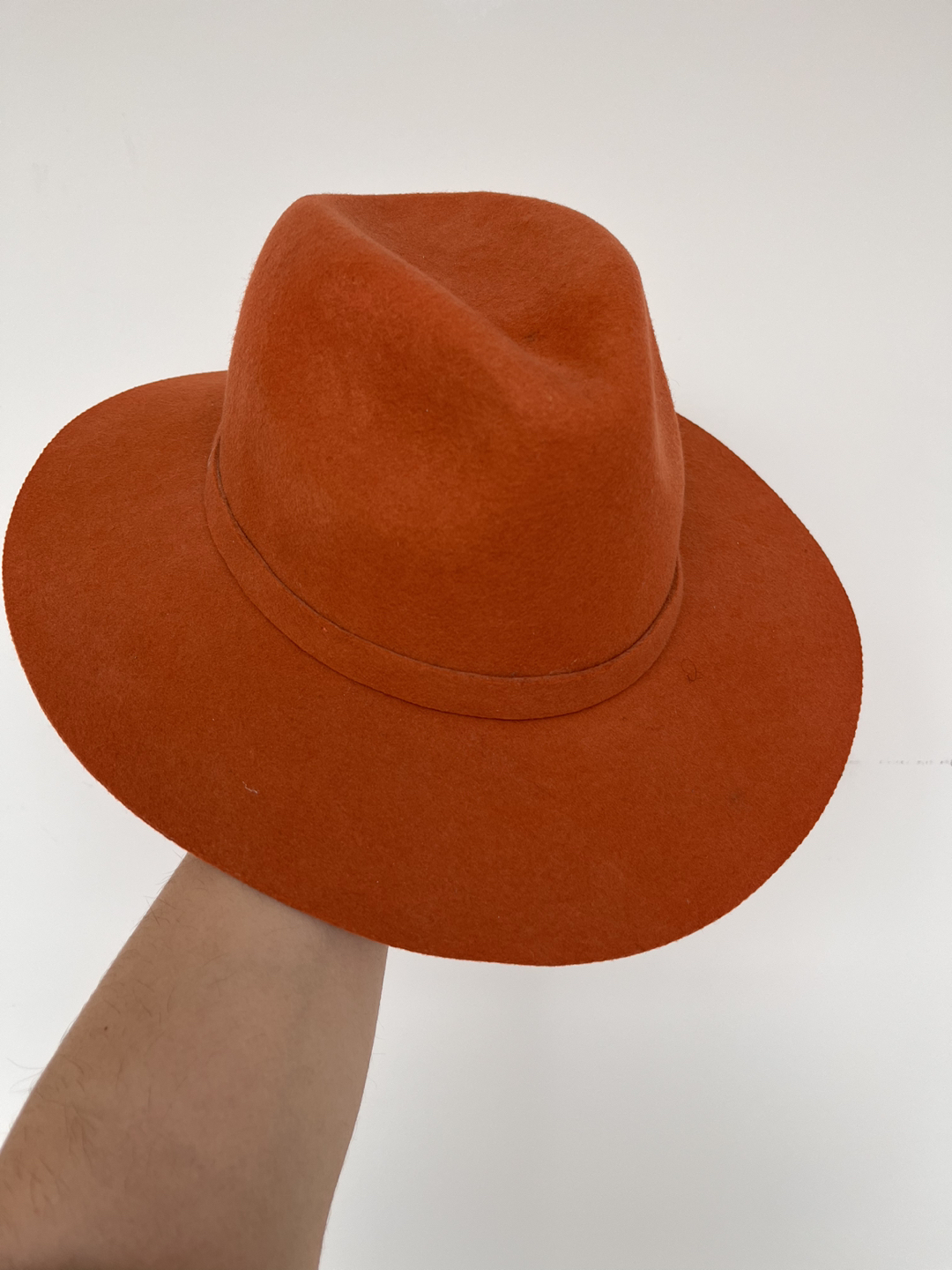100% wool hat in an orange colour. Is sized at a Large for those of us with bigger heads. Measures at 22 inches in diameter. Is in new condition, but has a tiny black stain at the top that’s barely visible.