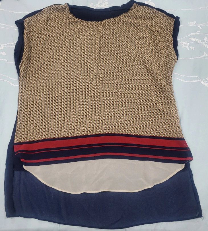 Short-sleeved top with a patterned design, featuring a layered hem with a beige, red and black striped section.