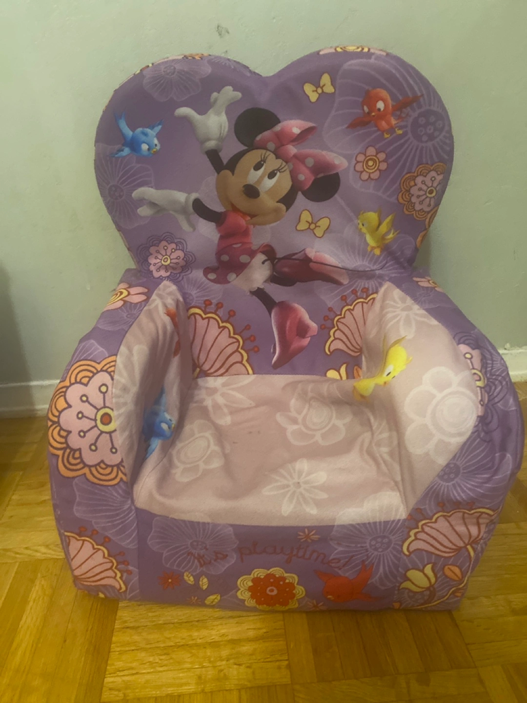 Purple and pink heart-shaped chair with Minnie Mouse design, featuring birds and a bunny. I’ve washed and let it dry although it has a stain at the bottom