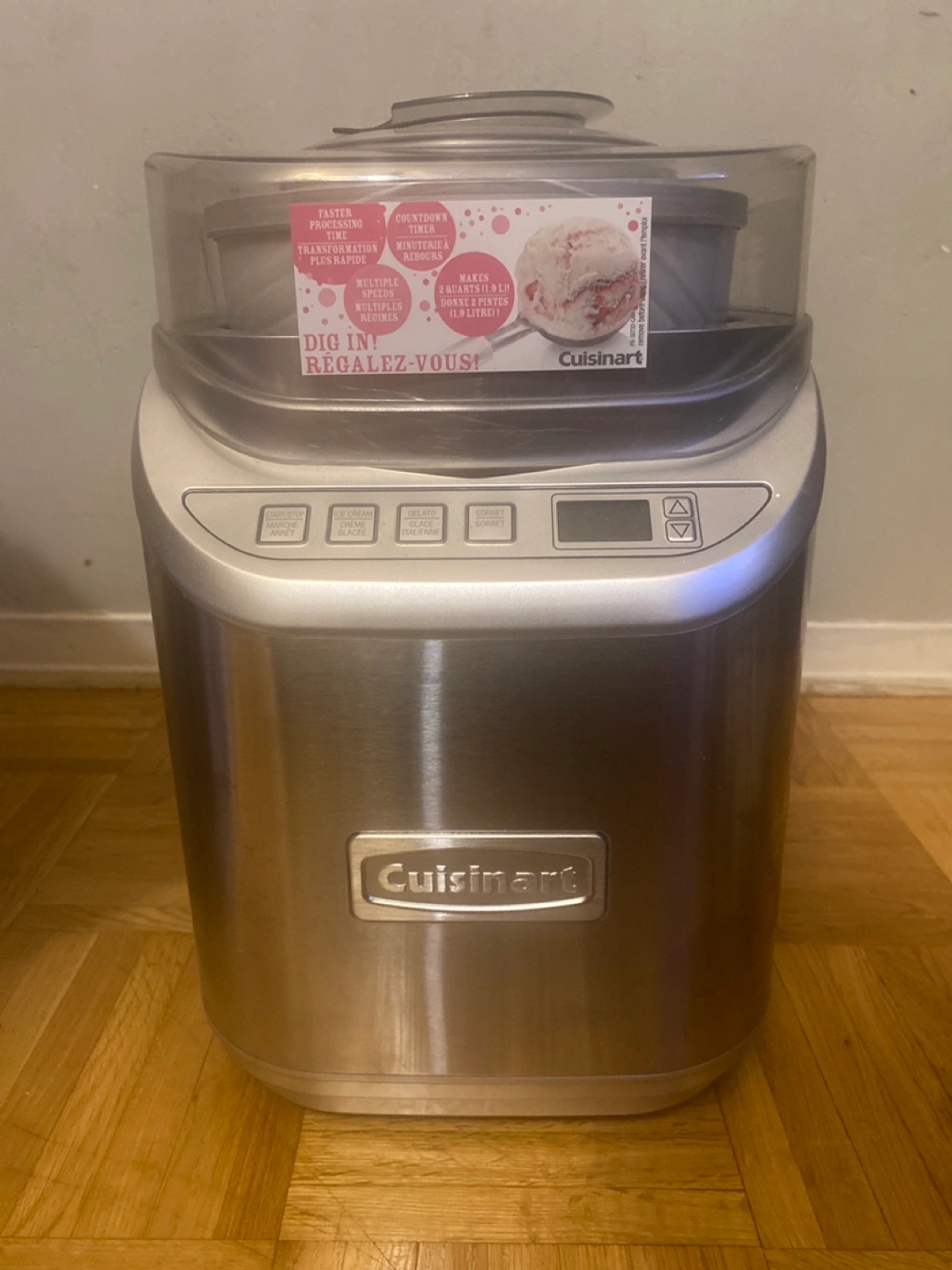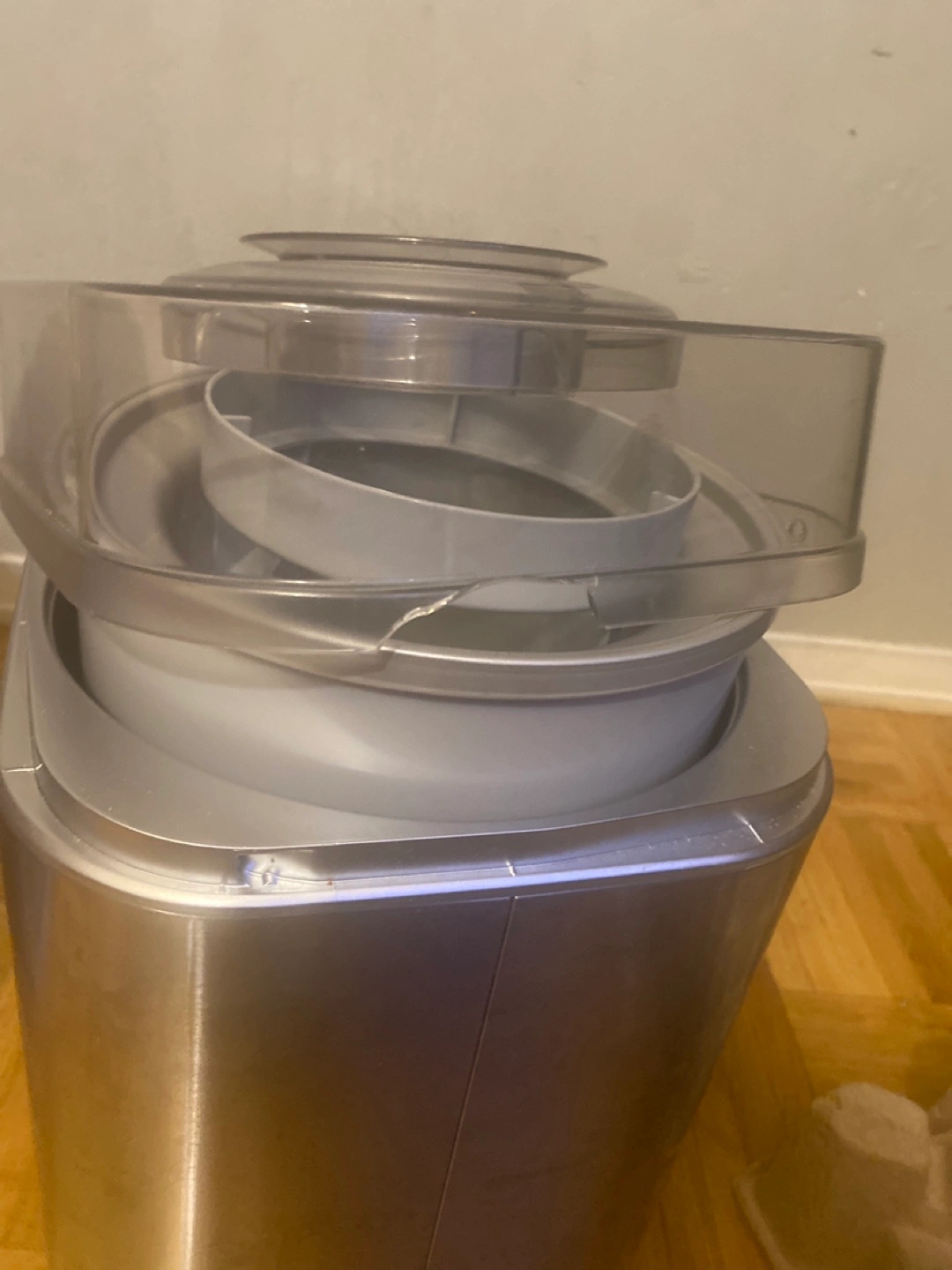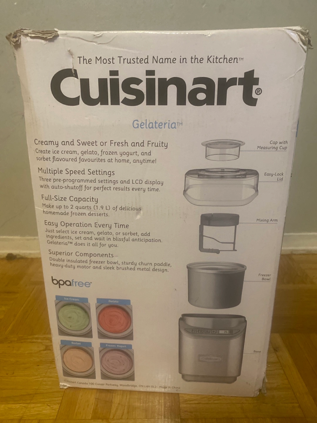 Ice cream maker, makes gelato, frozen yogurt, and sorbet. Has multiple speed settings and LCD display. Includes a freezer bowl, mixing arm, and lid. The kid is broken on the side but works well