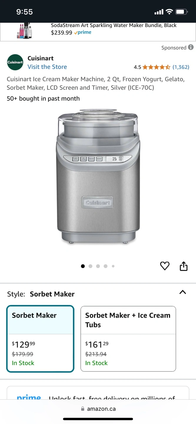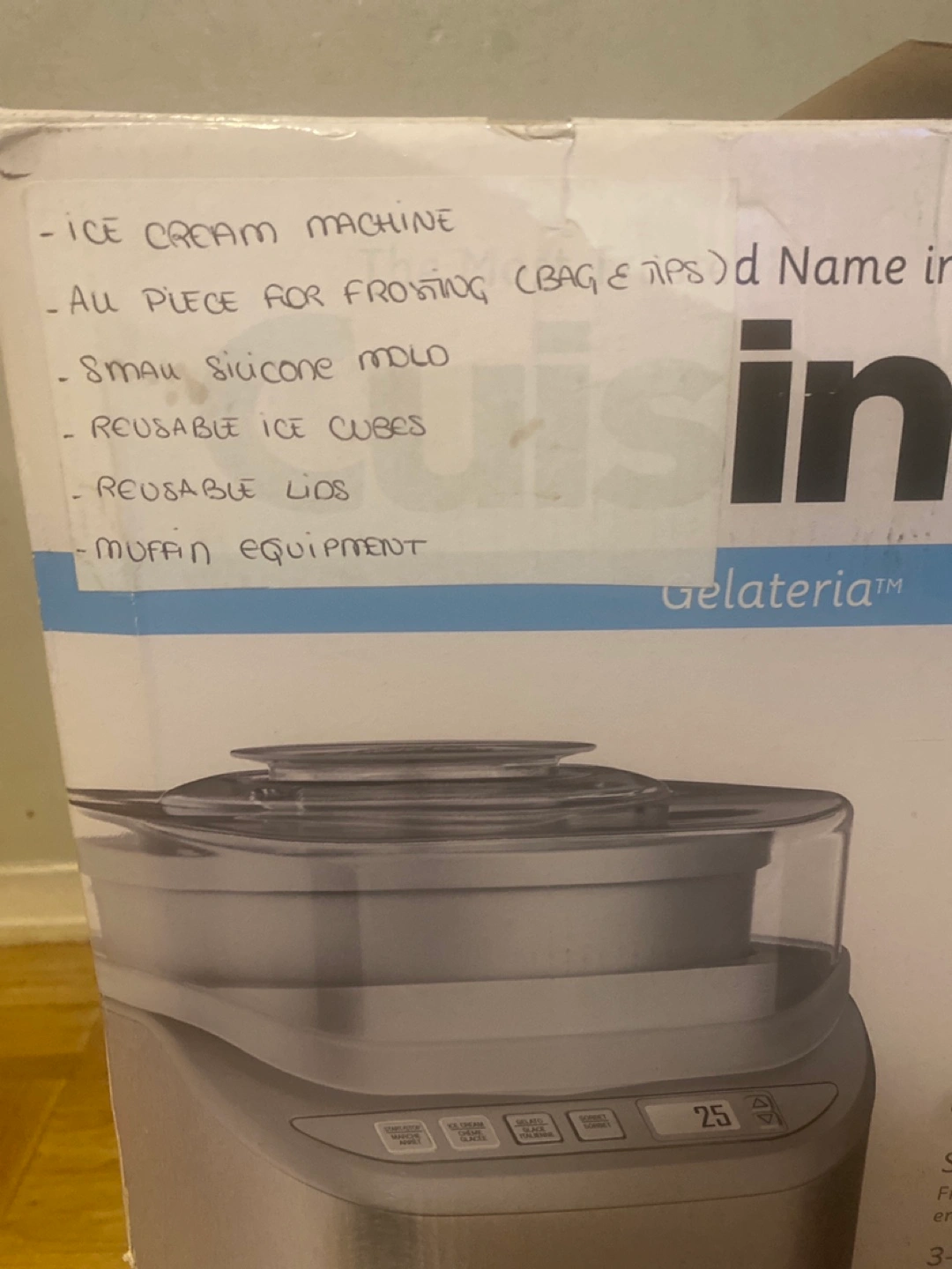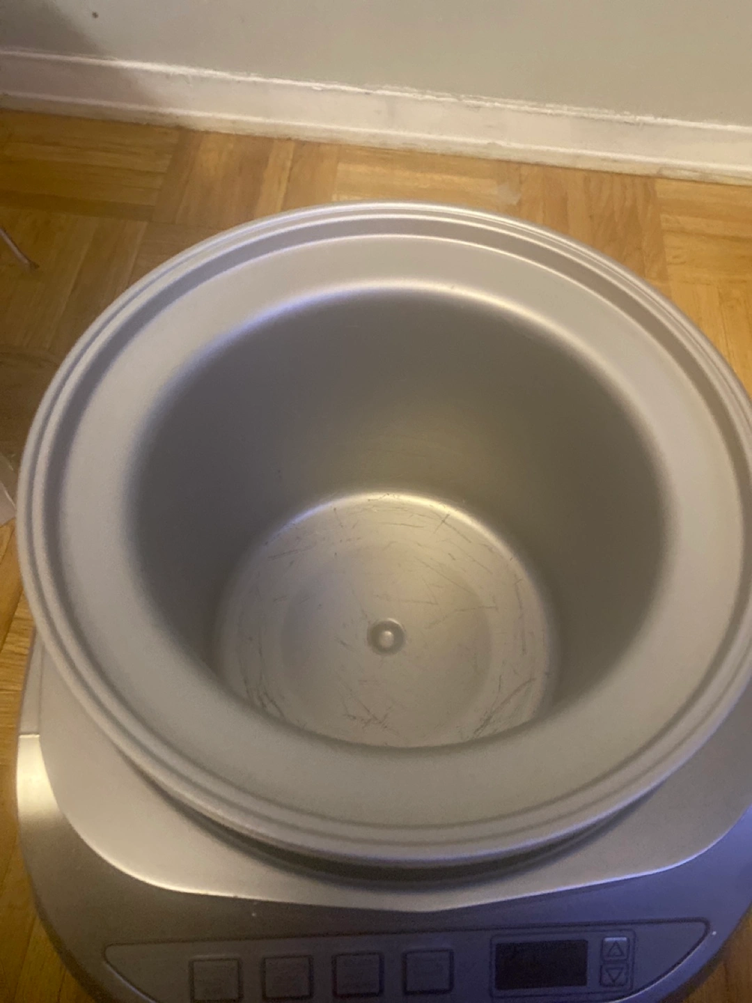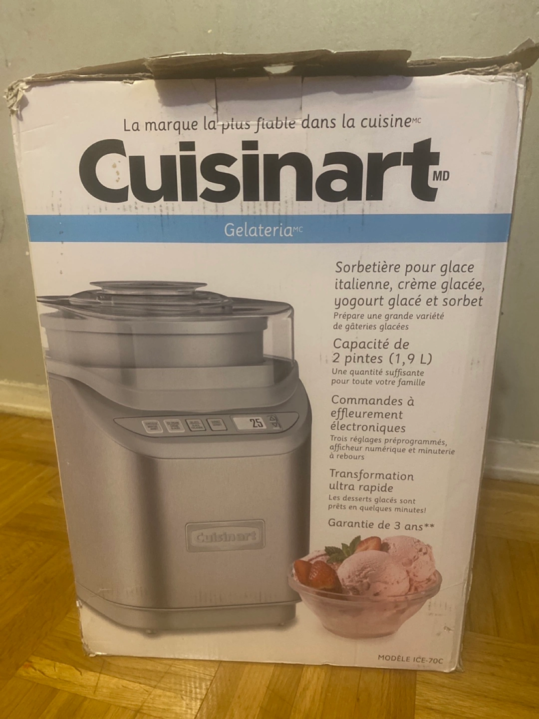 Ice cream maker, makes gelato, frozen yogurt, and sorbet. Has multiple speed settings and LCD display. Includes a freezer bowl, mixing arm, and lid. The kid is broken on the side but works well
