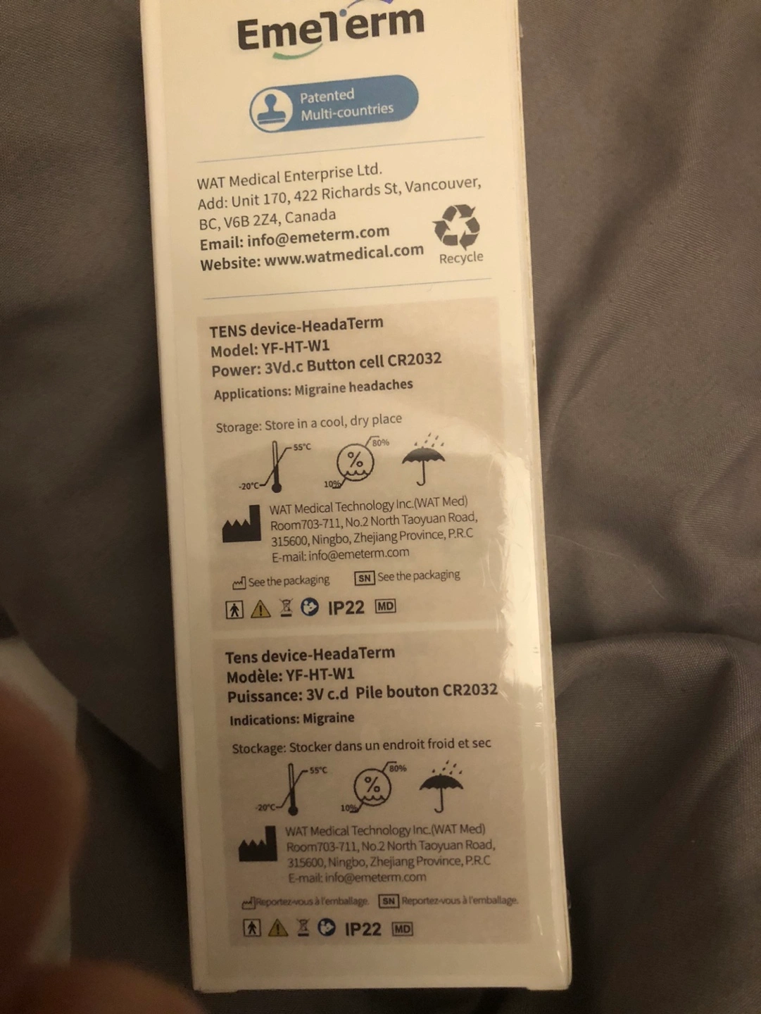 Drug free and non-invasive migraine treatment. No side effects as compared to anti-migraine oral medication. Effective quick relief against migraine headaches: Migraine, Cluster Migraine, Tension headache. Five intensity levels to choose from, users can customise the settings to relieve their symptoms. Energy-efficient: Long standby mode. Operates for over seven hours. Compact, Portable & disposable, making it convenient not only to use at home or at the office, but also on trips and outdoor travelling. TGA Registered. FDA cleared