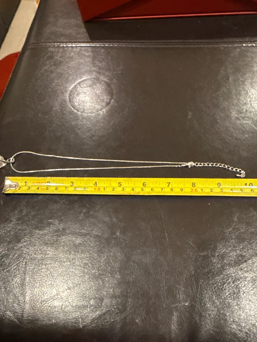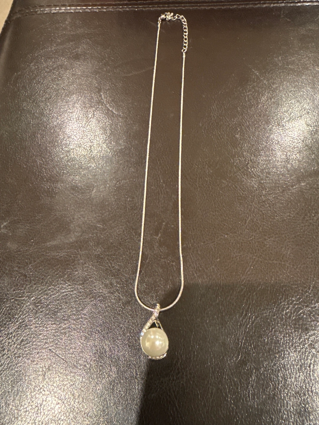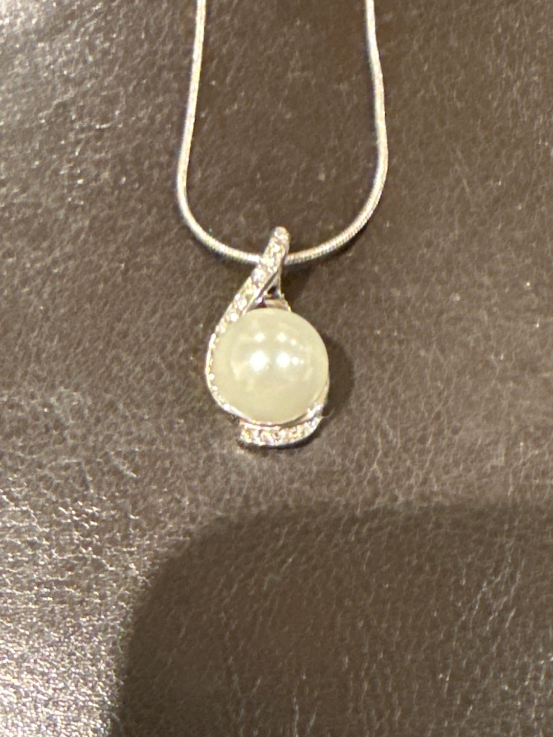 Silver chain necklace with an artificial pearl pendant. The pendant features a large pearl in a silver setting with small clear stones. Chain: 40cm + 5 cm extension