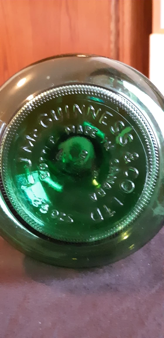 Green glass whiskey decanter with cork stopper Made in Ireland by L.J. McGuinness & co.