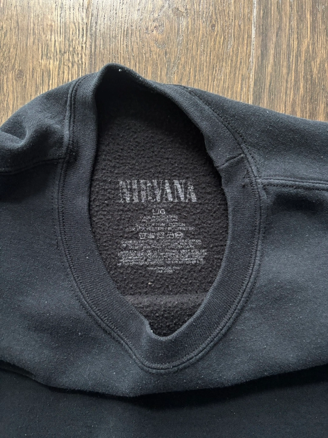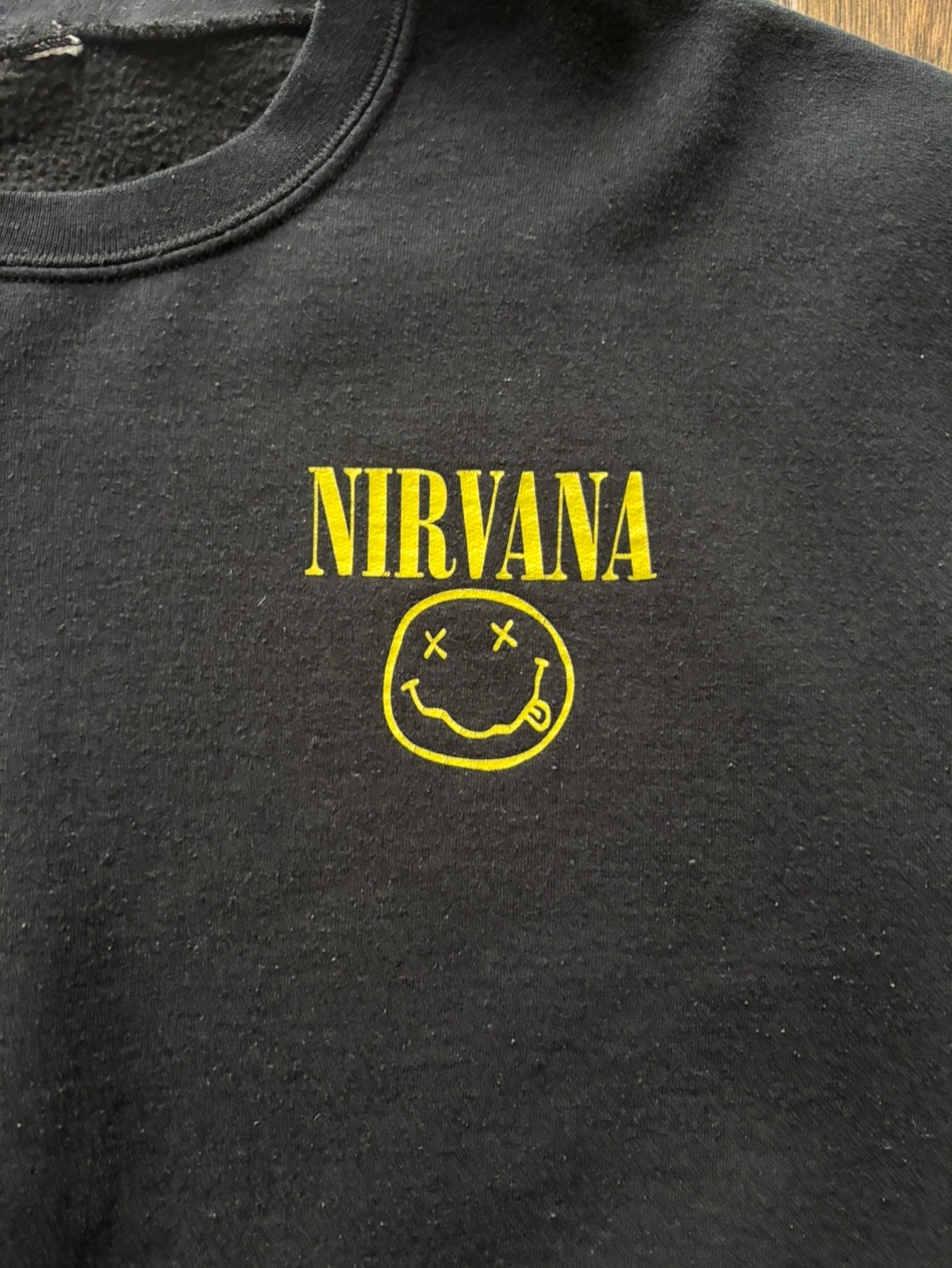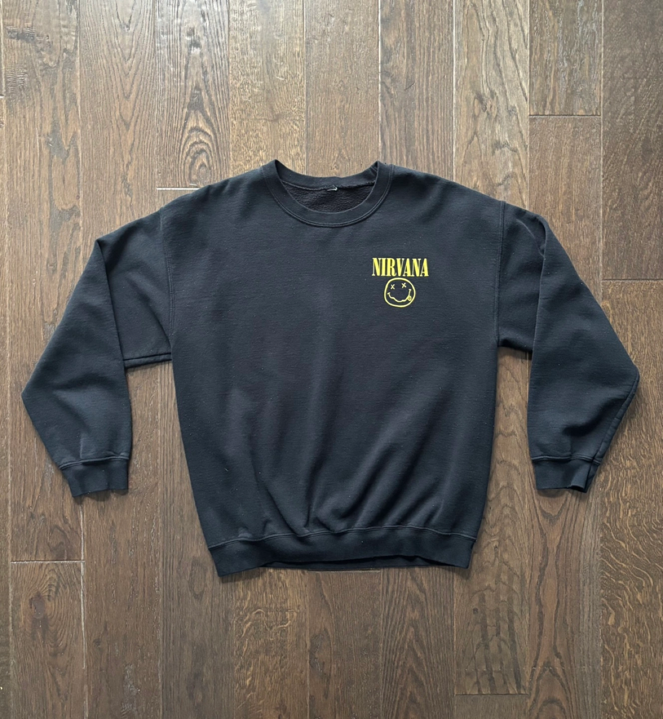 Black sweatshirt with yellow smiley face graphic and band name. Crew neck, long sleeves.