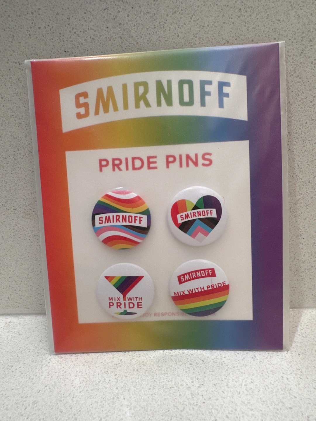 Set of four Smirnoff pride pins. One circular pin with rainbow stripes, one with a rainbow heart, one circular pin with a martini glass and rainbow stripes, and one circular pin with rainbow stripes and the words 'Mix with Pride'.