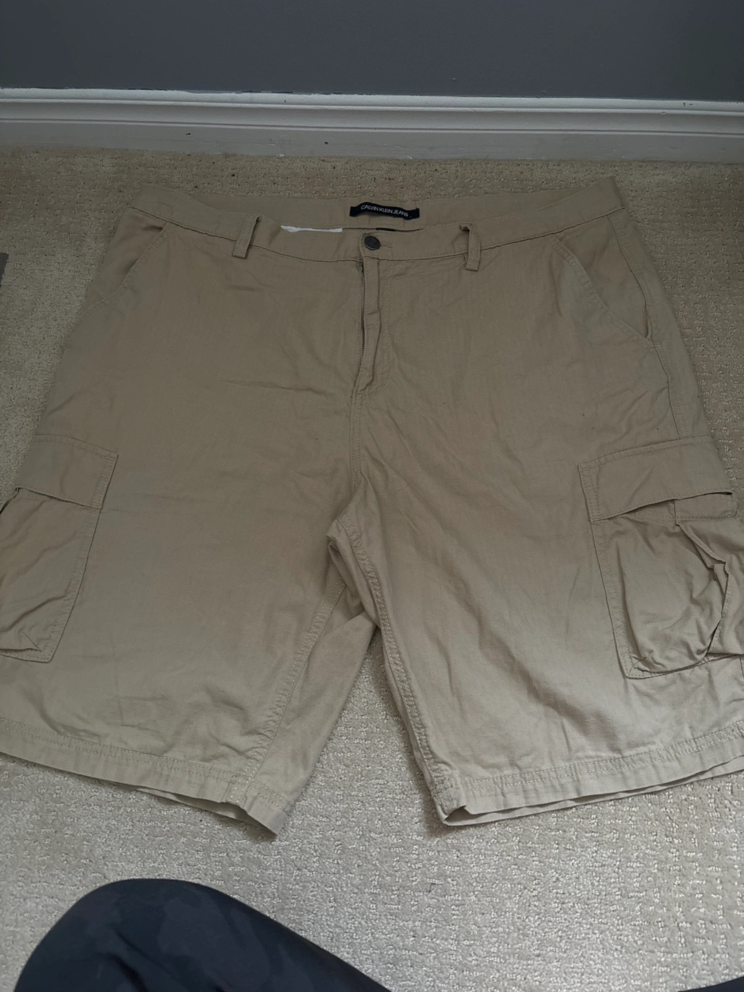 Beige cargo shorts with multiple pockets. Size 38.