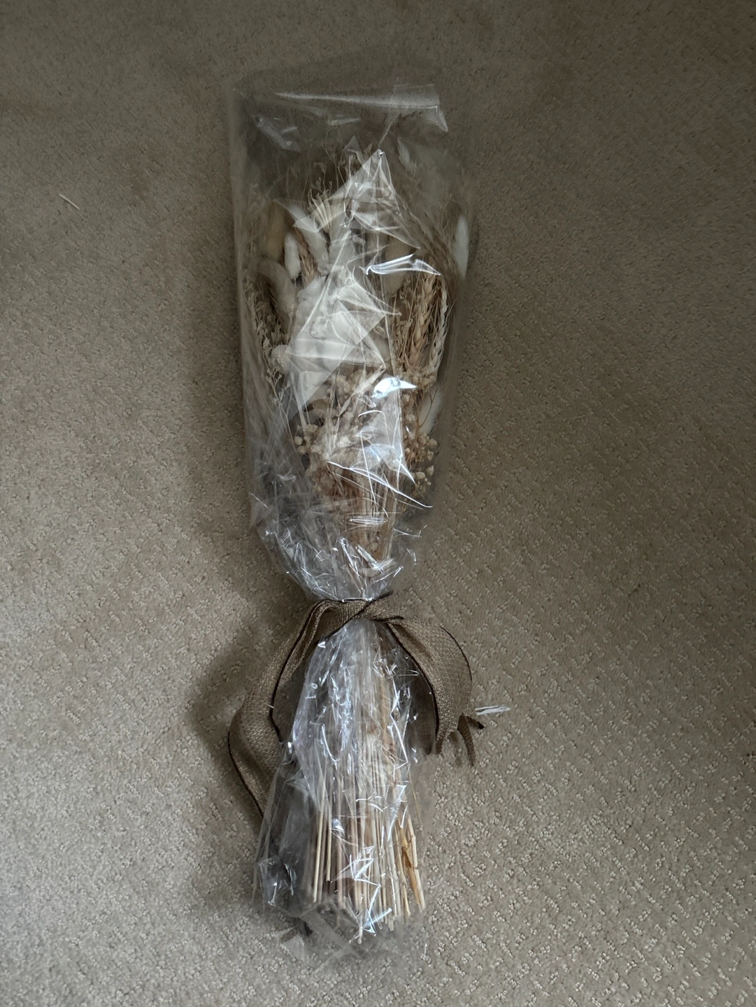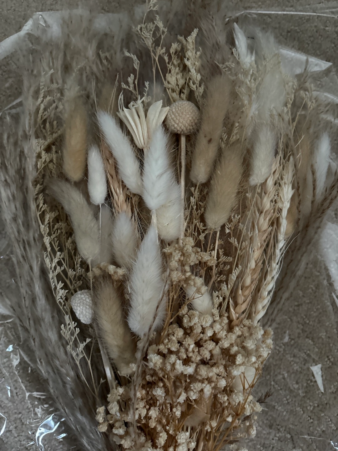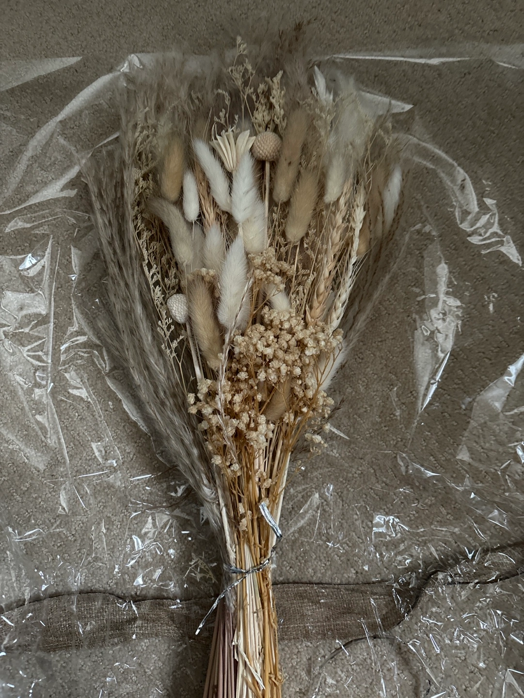 Dried flower bouquet in a neutral colour palette. The bouquet is tied with twine and wrapped in plastic. Great for gifting !