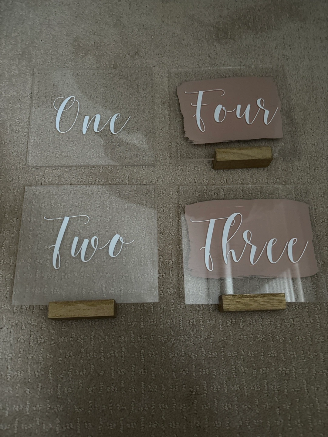 Set of 25 acrylic table numbers. Comes with wooden stands. Perfect for weddings, parties, or special occasions. 3-25 painted with rose paint - can be removed as displayed in 1-2.