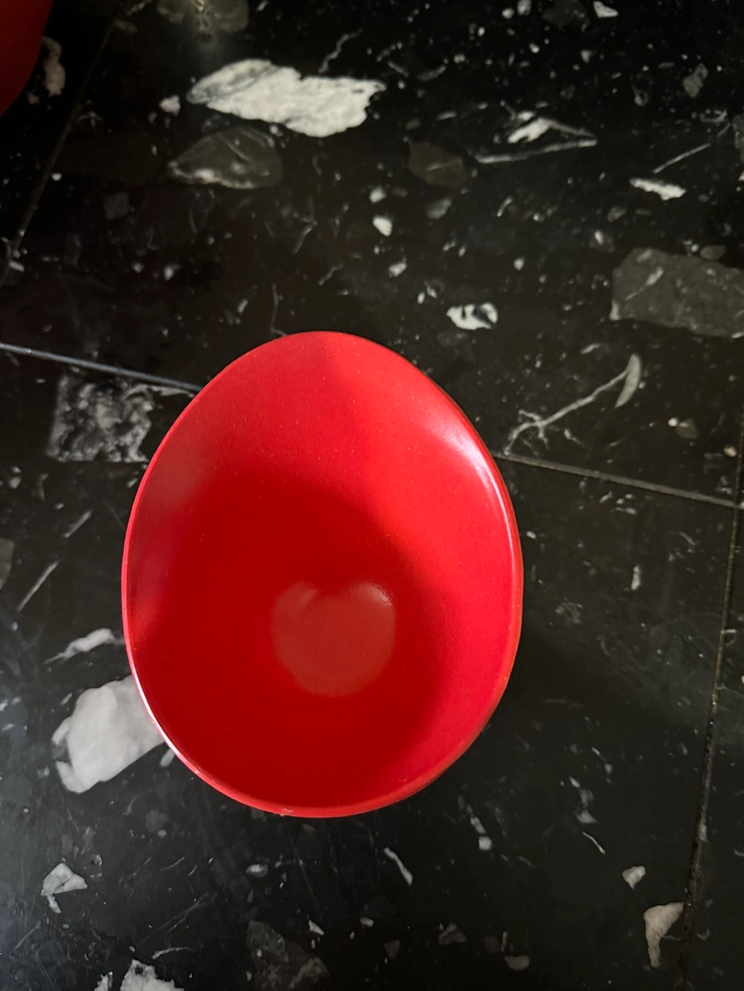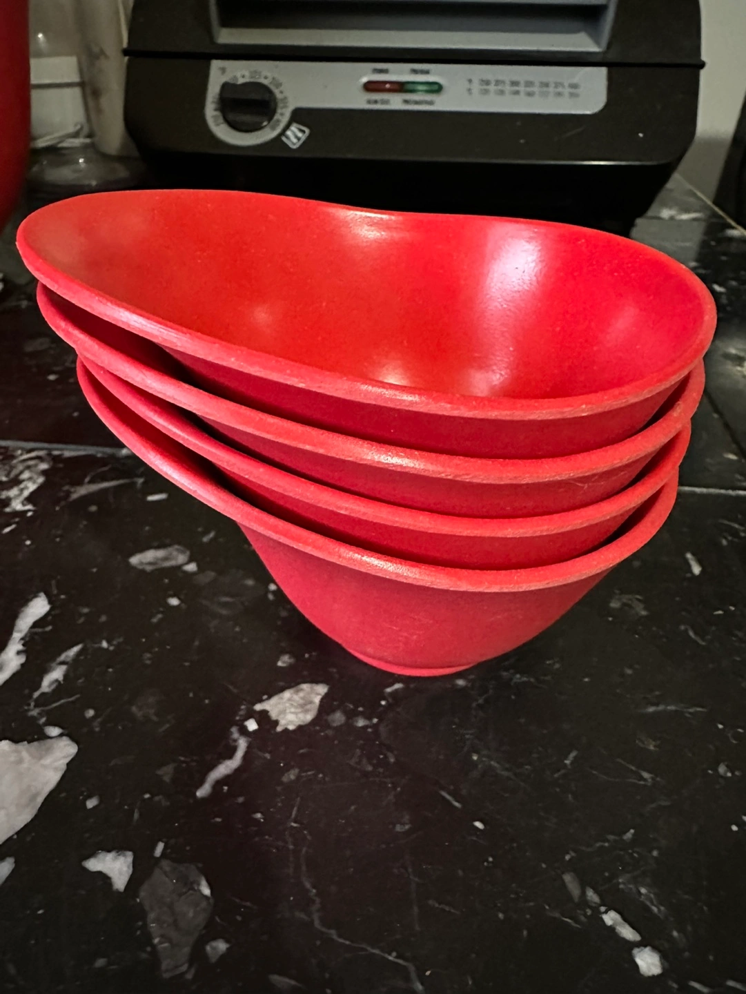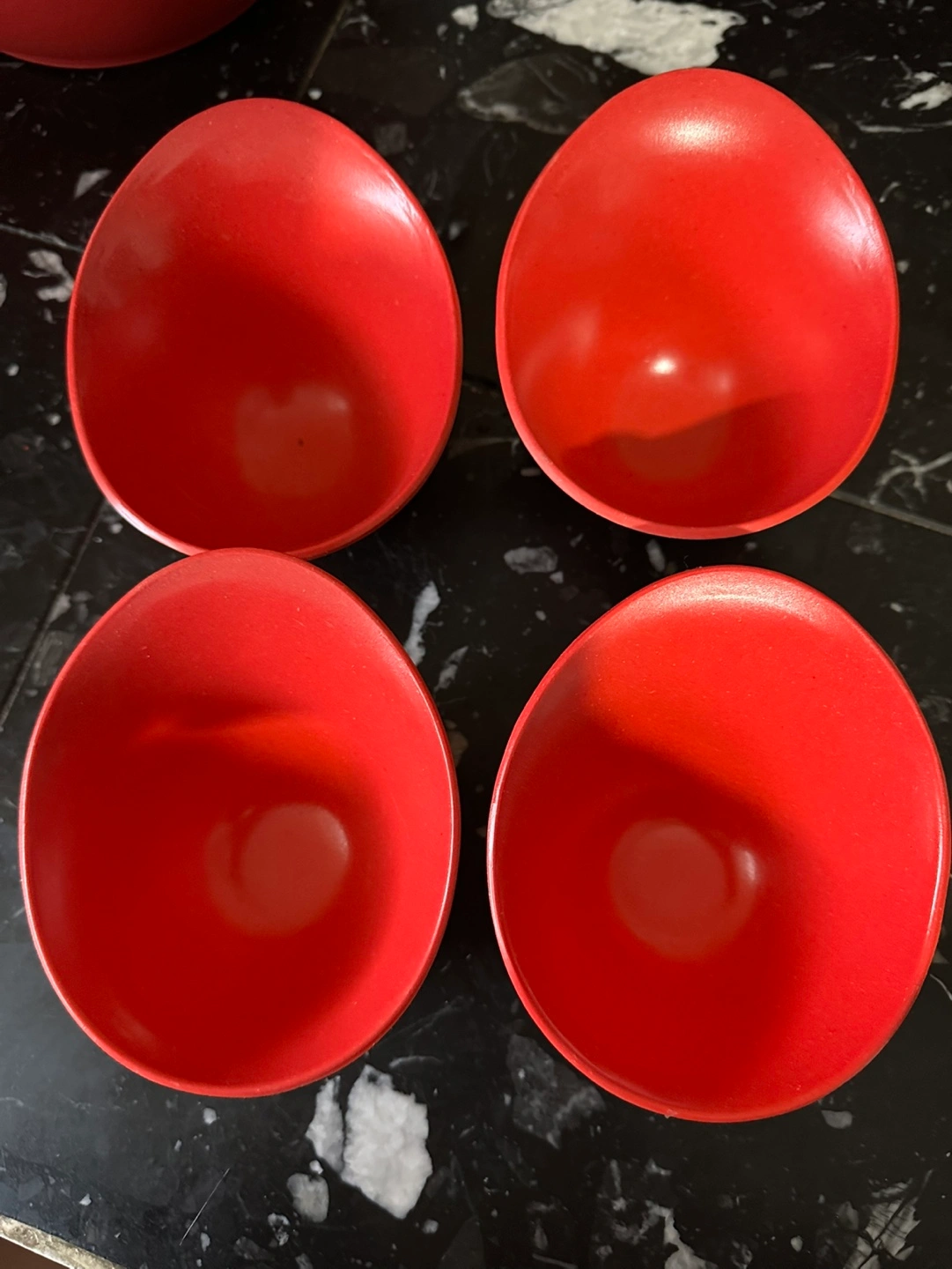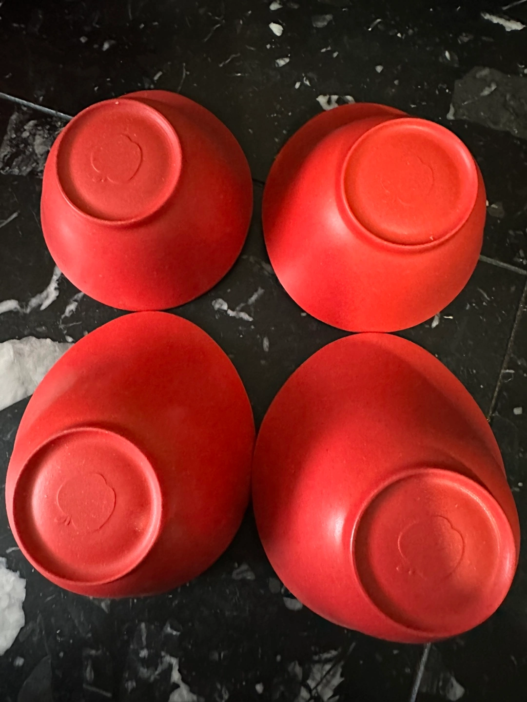 Set of 4 red eco melamine bowls. Brand new, never used, good for baking to hold ingredients prior to mixing or to use as pinch bowls to hold spices. Smoke free home.