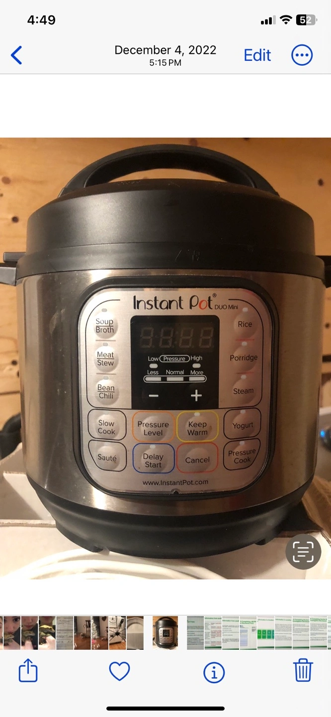 Instant Pot with various cooking settings, including pressure cooking, saute, slow cooking, and more. Never used. Manual included. No box