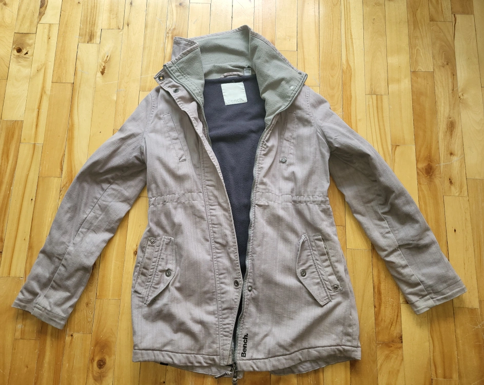 Women's light grey coat with a fleece lining and designer angles giving it a lovely fit. Brand: BENCH Size S-M. Zipper and button closure. Multiple pockets. Great condition, lovely and cosy and warm :) Only selling as downsizing my closet! -- Pick up Downtown West End Vancouver --
