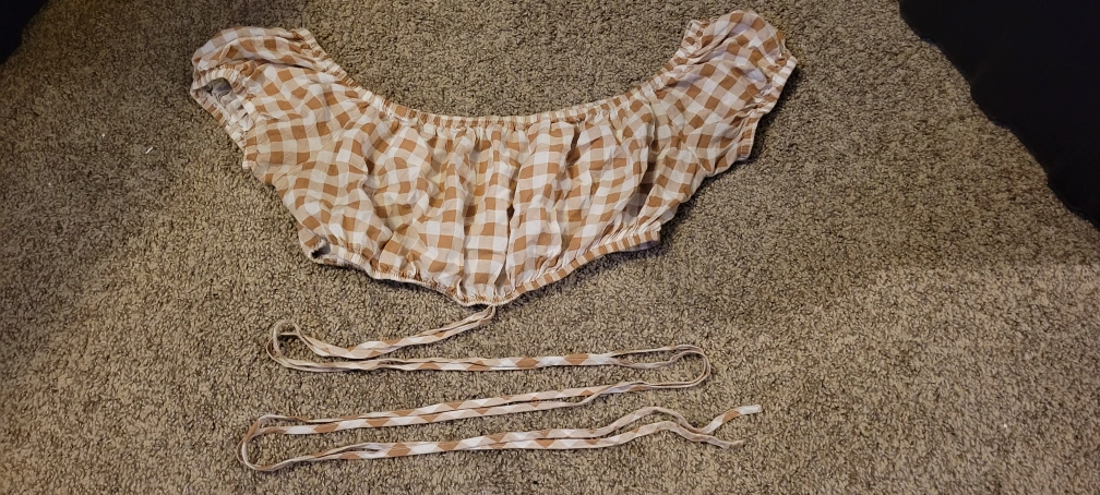Show allBrown and white gingham off the shoulder crop top with tie straps. Short sleeves. lightly used
