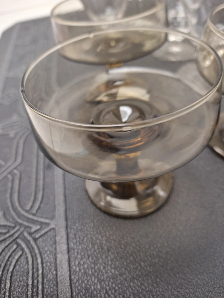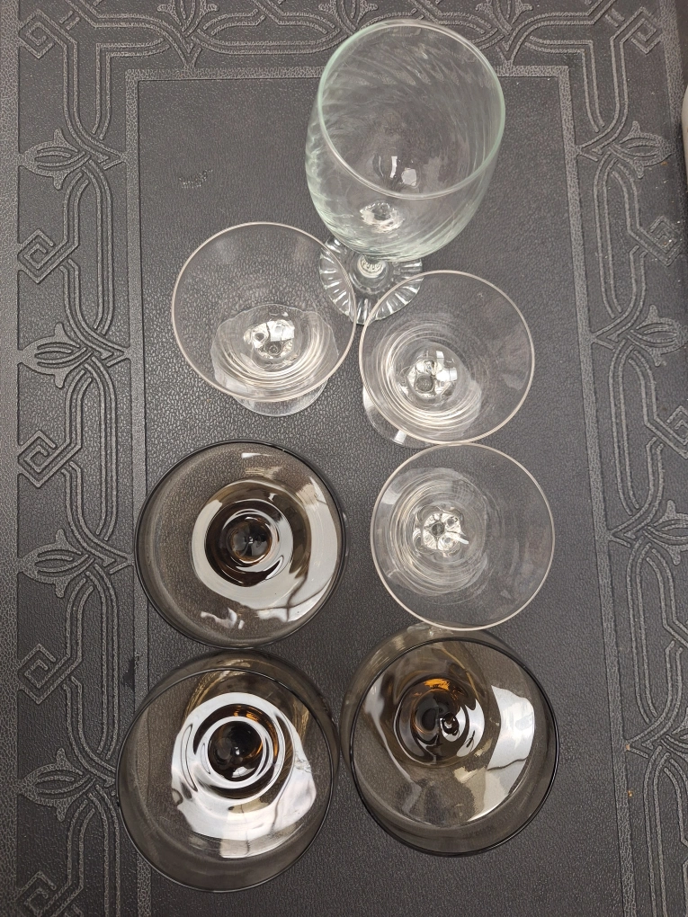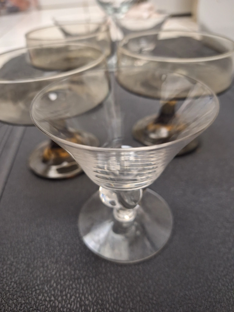 Set of 6 vintage glasses, including two wine glasses and four smaller stemmed glasses. In good condition.