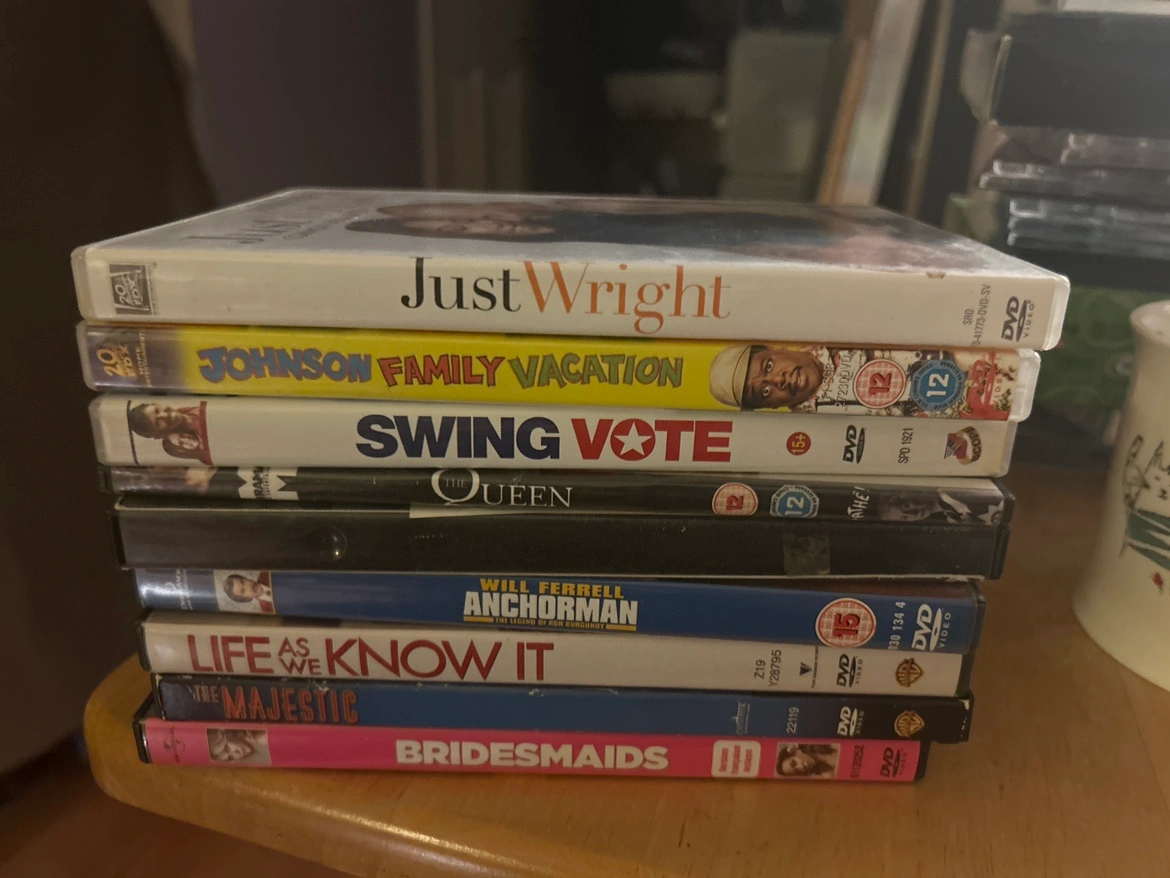 Lot of six DVDs, includes: Johnson Family Vacation, Swing Vote, Just Wright, The Queen, Anchorman: The Legend of Ron Burgundy, Life as We Know It. Also includes The Majestic and Bridesmaids.