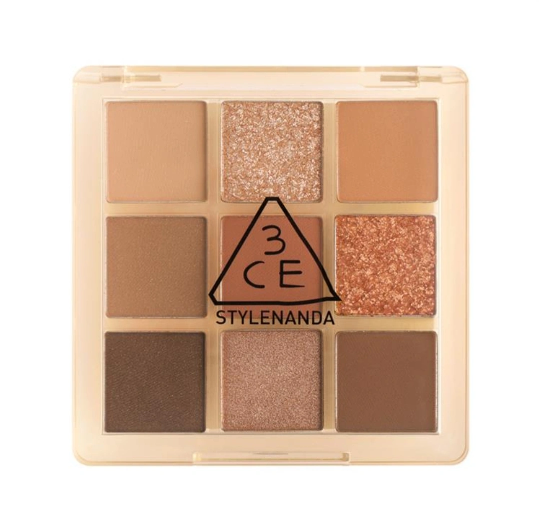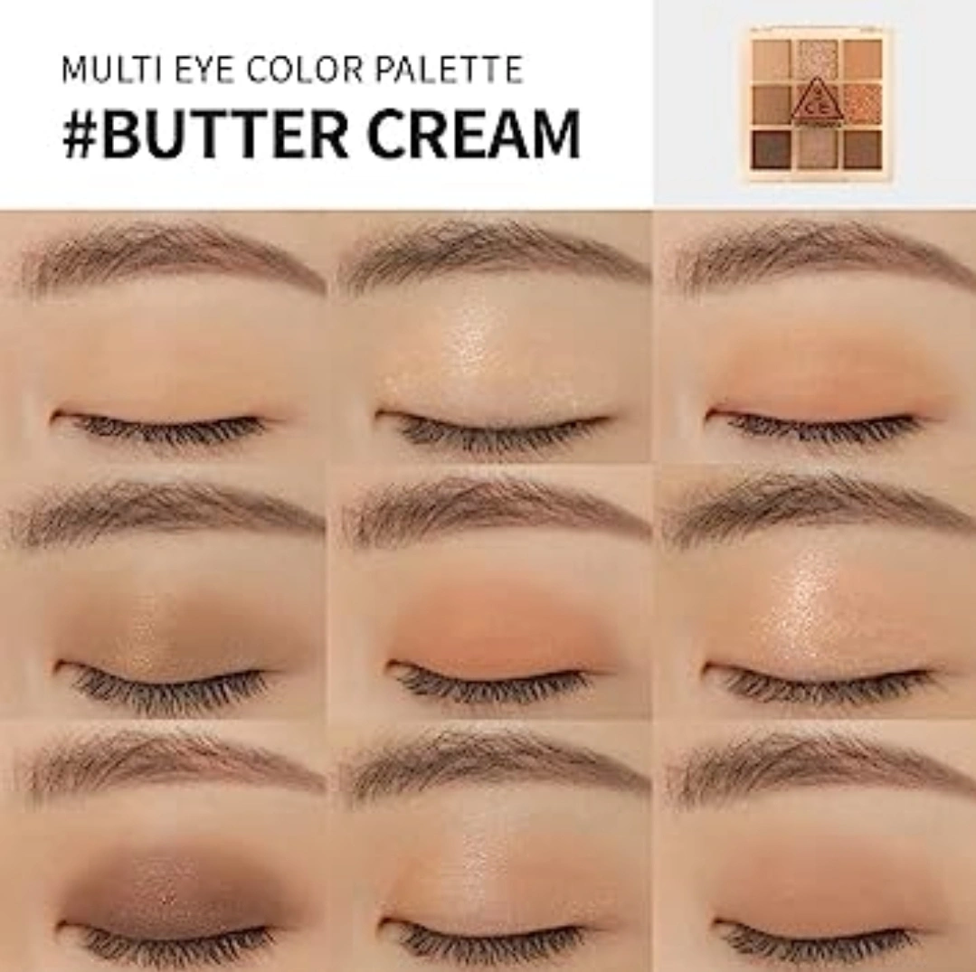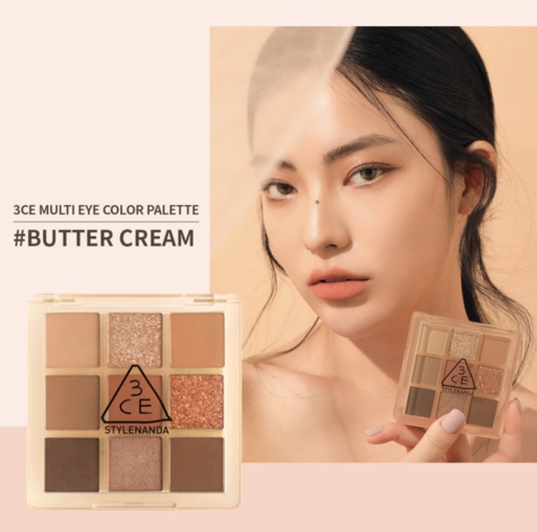 3CE eyeshadow palette in the shade #Butter Cream. Contains nine eyeshadows in a variety of finishes, including matte, shimmer, and glitter.